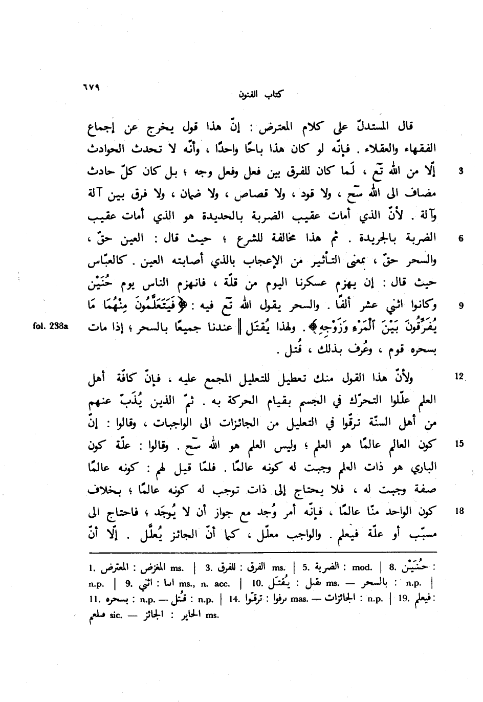 قال المستدل على كلام المعترض: إن هذا قول يخرج عن إجماع الفقهاء والعقلاء. فإنه لو كان هذا باحًا واحدًا، وأنه لا تحدث الحوادث إلا من الله تع، لما كان للفرق بين فعل وفعل وجه؛ بل كان كل حادث مضاف إلى الله سح، ولا قود، ولا قصاص، ولا ضمان، ولا فرق بين آلة وآلة. لأن الذي أمات عقيب الضربة بالحديدة هو الذي أمات عقيب الضربة الجديدة. ثم هذا مخالفة للشرع؛ حيث قال: العين حق، والسحر حق، بمعنى التأثير من الإعجاب بالذي أصابته العين. كالعباس حيث قال: إن يهزم عسكرنا اليوم من قلة، فانهزم الناس يوم حنين وكانوا اثنى عشر ألفًا. والسحر يقول الله تع فيه: {فيتعلمون منهما من يفرقون به بين المرء وزوجه}. ولهذا يقتلعندنا جميعًا بالسحر؛ إذا مات بسحره قوم، وعرف بذلك، قتل.