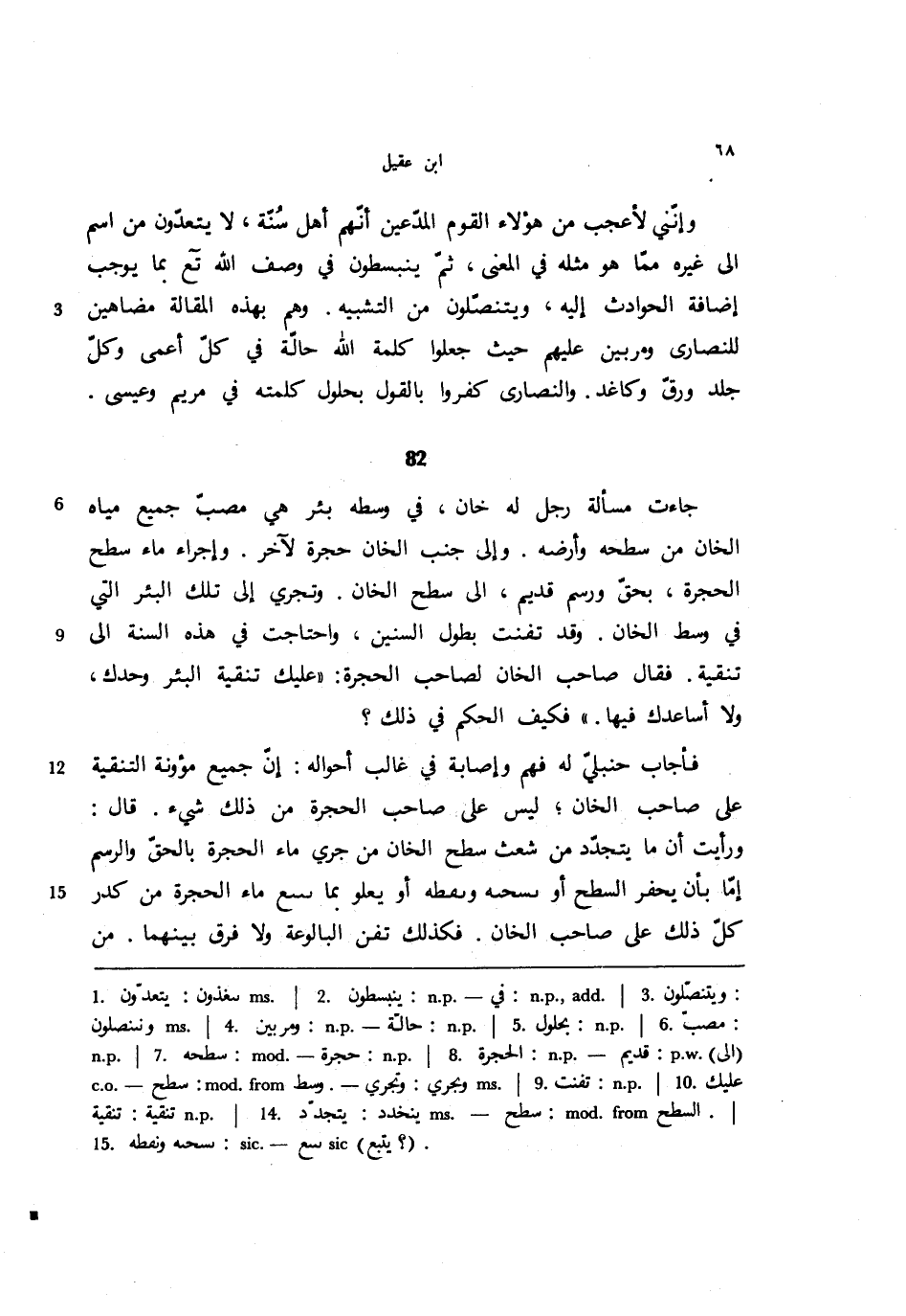 فأجاب الحنبلي له فهم وإصابة في غالب أحواله: إن جميع مؤونة التنقية على صاحب الخان؛ ليس على صاحب الحجرة من ذلك شيء. قال: ورأيت أن ما يتجدد من شعث سطح الخان من جري ماء الحجرة بالحق والرسم إما بأن يحفر السطح أو؟ ؟ ؟ ؟ ؟ ؟ ؟ أو يعلو بما تمتع ماء الحجرة من كدر كل ذلك على صاحب الخان. فكذلك تفن البالوعة ولا فرق بينهما. من