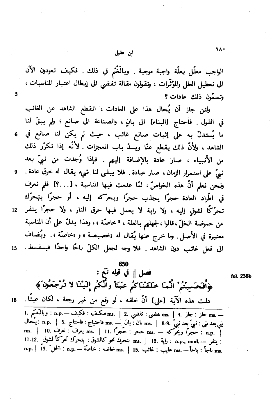 ولئن جاز أن يحال هذا على العادات، انقطع الشاهد عن الغائب في القول. فاحتاج [البناء] إلى بانٍ، والصناعة إلى صانع؛ ولم يبق لنا ما يستدل به على إثبات صانع غائب، حيث لم يكن لنا صانع في الشاهد، ولأن ذلك يقطع عنا ويسد باب المعجزات. لأنه إذا تكررر ذلك من الأنبياء، صار عادة بالإضافة إليهم. فإذا وجدت من نبي بعد نبي على استمرار الزمان، صار عبادة. فلا يبقى لنا شيء يقال له خرق عادة. ونحن نعلم أن هذه الخواص، لما عدمت فيها المناسبة، [ ... ؟ ] فلم نعرف في اطراد العادة حجرًا يجذب حجرًا ويحركه إليه، أو حجرًا يتحرك تحركًا لشوقٍ إليه، ولا راية لا يعمل فيها حرق النار، ولا حجرًا ينفر عن حموضة الخل، قالوا، لجهلهم بالعلة، ((خاصة))، وهذا يدل على أن المناسبة معتبرة في الأصل. وما خرج عنها يقال له ((خصيصة)) و ((خاصة)). ويضاف إلى فعل غائب دون الشاهد. فلا وجه لجعل الكل باحًا واحدًا فيسفسط.