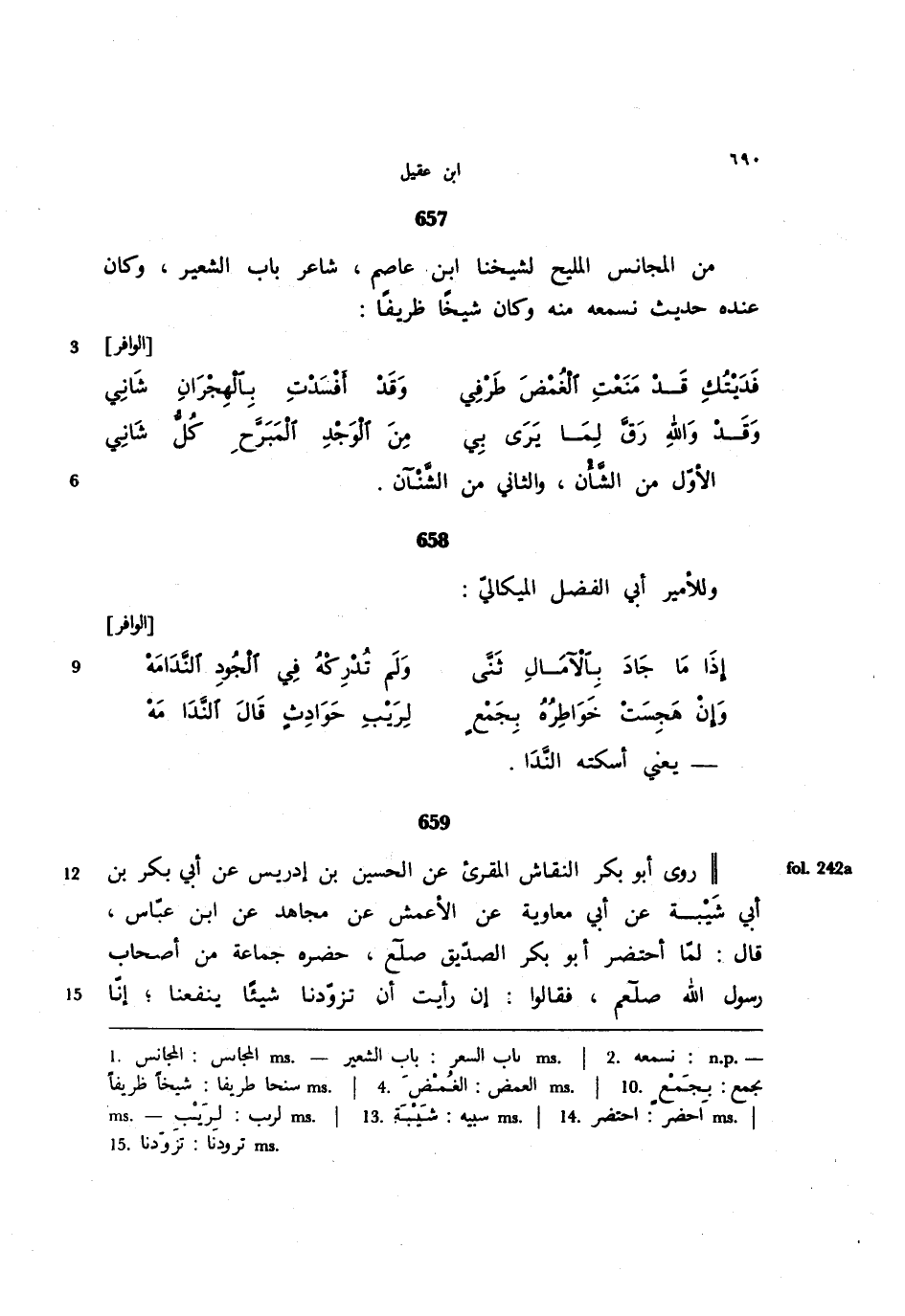 657 - من المجانس المليح لشيخنا ابن عاصم، شاعر باب الشعير، وكان عنده حديث نسمعه منه وكان شيخنا ظريفًا: