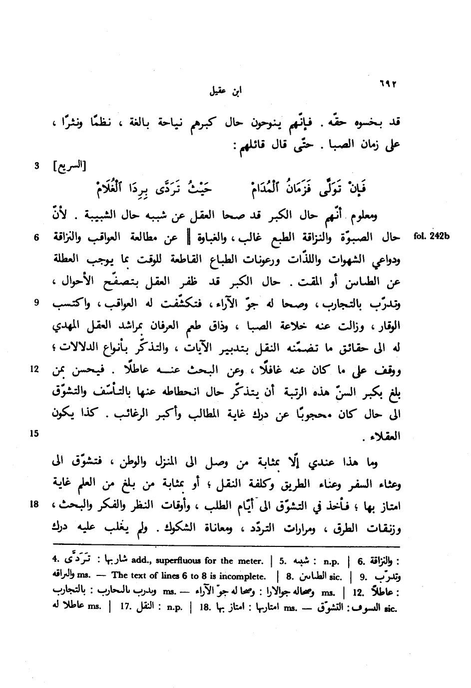 ومعلوم أنهم حال الكبر قد صحا العقل عن شببه حال الشبيبة. لأن حال الصبوة والنزاقة الطبع غالب، والغباوة عن مطالعة العواقب والنزاقة ودواعي الشهوات واللذات ورعونات الطباع القاطعة للوقت بما يوجب العطلة عن الطامن أو المقت، حال الكبر قد ظفر العقل بتصفح الأحوال، وتدرب بالتجارب، وصحا له جو الآراء، فتكشفت له العواقب، واكتسب الوقار، وزالت عنه خلاعة الصبا، وذاق طعن العرفان بمراشد العقل المهدي له إلى حقائق ما تضمنه النقل بتدبير الآيات، والتذكر بأنواع الدلالات، ووقف على ما كان عنه غافلًا، وعن البحث عنه عاطلًا. فيحسن بمن بلغ بكبر السن هذه الرتبة أن يتذكر حال انحطاطه عنها بالتأسف والتشوق إلى حال كان محجوبًا عن درك غاية المطالب واكبر الرغائب. كذا يكون العقلاء.