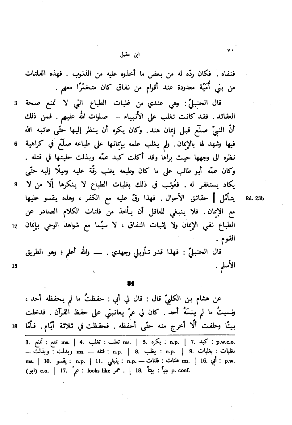 84 - عن هشام بن الكلبي قال: قال لي أبي: حفظت ما لم يحفظه أحد، ونسيت ما لم ينسه أحد. كان لي عم يعاتبني على حفظ القرآن. فدخلت بيتاً وحلفت ألا أخرج منه حتى أحفظه. فحفظت في ثلاثة أيام. فأما