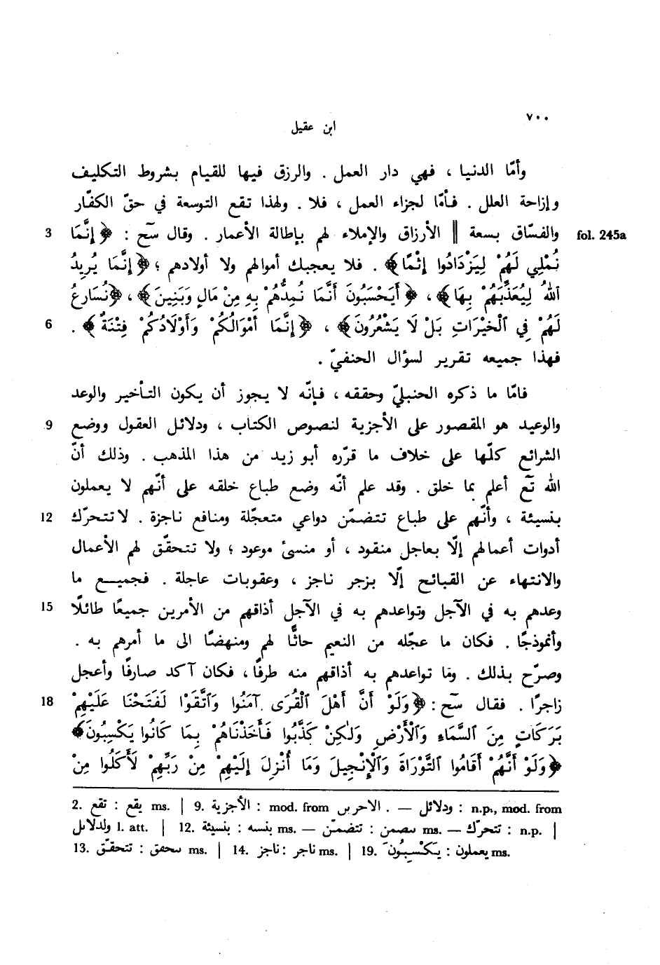 فأما ما ذكره الحنبلي وحققه، فإنه لا يجوز أن يكون التأخير والوعد والوعيد هو المقصور على الأجزية لنصوص الكتاب، ودلائل العقول ووضع الشرائع كلها على خلاف ما قرره أبو زيد من هذا المذهب. وذلك أن الله تع أعلم بما خلق. وقد علم أنه وضع طباع خلقه على أنهم لا يعملون بنسيئة، وأنهم على طباع تتضمن دواعي متعجلة ومنافع ناجزه. لا تتحرك أدوات أعمالهم إلا بعاجل منقود، أو منسي موعود؛ ولا تتحقق لهم الأعمال والانتهاء عن القبائح إلا بزجر ناجز، وعقوبات عاجلة. فجميع ما وعدهم به في الآجل وتواعدهم به في الآجل أذاقهم من الأمرين جميعًا طائلًا وأنموذجًا. فكان ما عجله من النعيم حاثًا لهم ومنهضًا إلى ما أمرهم به. وصرح بذلك. وما تواعدهم به أذاقهم منه طرفًا، فكان أكد صارفًا وأعجل زاجرًا. فقال سح: {ولو أن أهل القرى آمنوا واتقوا لفتحنا عليهم بركات من السماء والأرض ولكن كذبوا فأخذناهم بما كانوا يكسبون} {ولو أنهم أقاموا التوراة والإنجيل وما أنزل إليهم من ربهم لأكلوا من