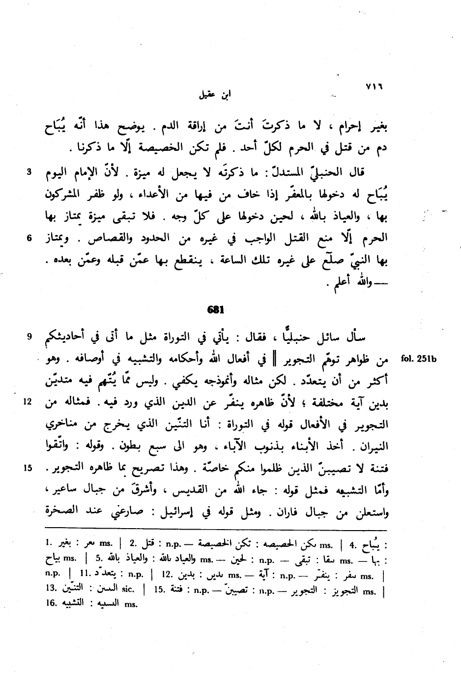 681 - سأل سائل حنبليًا، فقال: يأتي في التوراة مثل ما أتى في أحاديثكم من ظواهر توهم التجوير في أفعال الله وأحكامه والتشبيه في أوصافه. وهو أكثر من أن يتعدد. لكن مثاله وأنموذجه يكفي. وليس مما يتهم فيه متدين بدين آية مختلفة؛ لأن ظاهره ينفر عن الدين الذي ورد فيه. فمثاله من التجوير في الأفعال قوله في التوراة: أنا التنين الذي يخرج من مناخري النيران. أخذ الأبناء بذنوب الآباء، وهو إلى سبع بطون. وقوله: واتقوا فتنة لا تصيبن الذين ظلموا منكم خاصة. وهذا تصريح بما ظاهره التجوير. وأما التشبيعه فمثل قوله: جاء الله من القديس، وأشرق من جبال ساعير، واستعلن من جبال فاران. ومثل قوله في إسرائيل: صارعني عند الصخرة