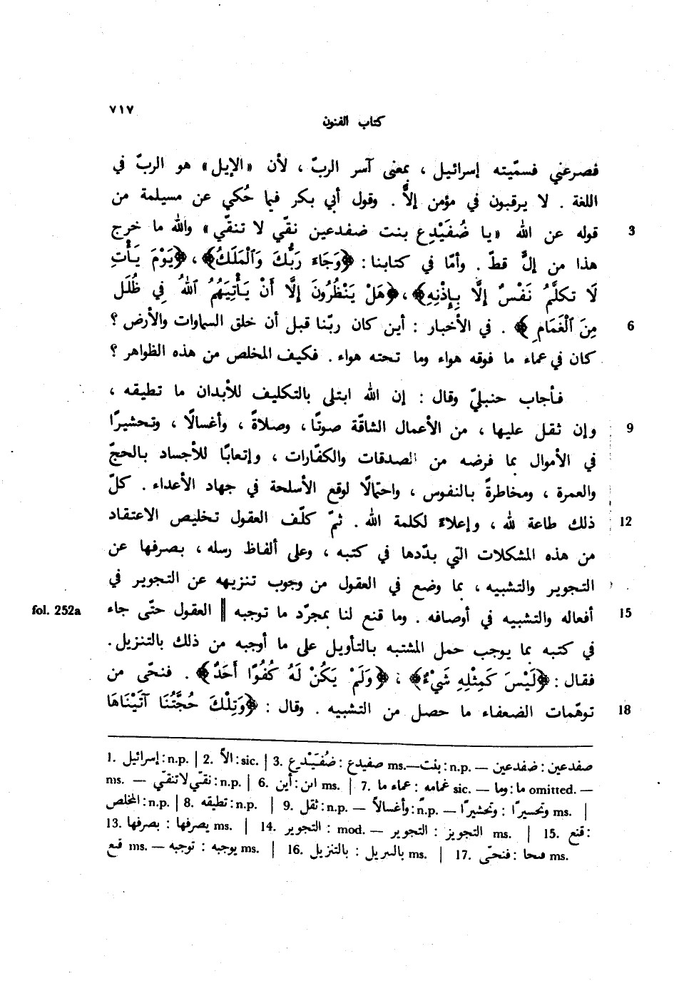 فصرعني فسميته إسرائيل، بمعنى آسر الرب، لأن ((الإيل)) هو الرب في اللغة. لا يرقبون في مؤمن إلا. وقول إبي بكر فيما حكي عن مسيلمة من قوله عن الله ((يا ضفيدع بنت ضفدعين نقي لا تنقي)) والله ما خرج هذا من إل قط. وأما في كتابنا: {وجاء ربك والملك}، {يوم يأت لا تكلم نفس إلا بإذنه}، {هل ينظرون إلا أن يأتيهم الله في ظلل من الغمام}. في الأخبار: أين كان ربنا قبل أن خلق السماوات والأرض؟ كان في عماء ما فوقه هواء وما تحته هواء. فكيف المخلص من هذه الظواهر؟