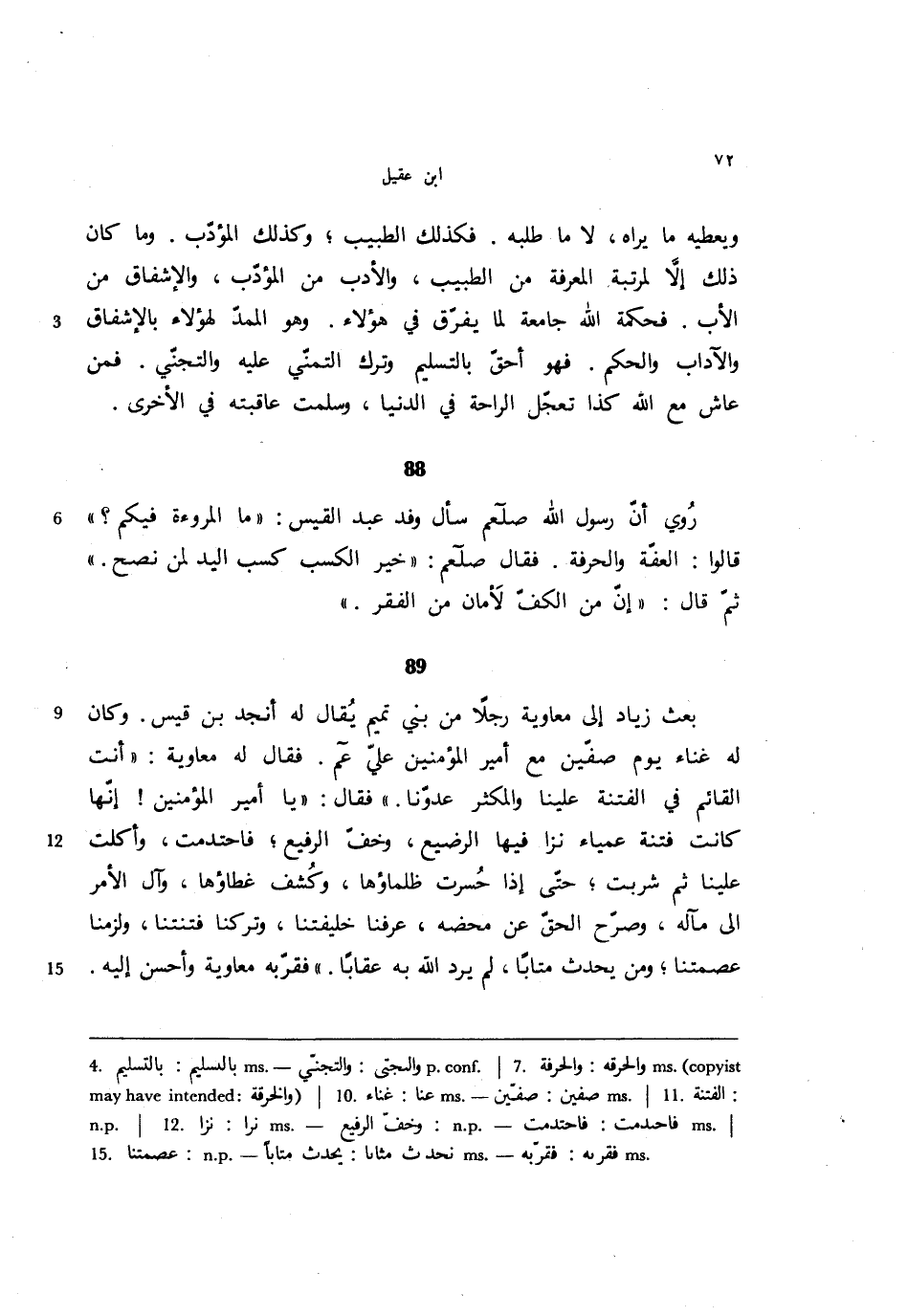 88 - روي أن رسول الله صلعم سأل وفد عبد القيس: ((ما المروءة فيكم؟ )) قالوا: العفة والحرفة. فقال صلعم: ((خير الكسب كسب اليد لمن نصح.)) ثم قال: ((إن من الكف لأمان من الفقر.))