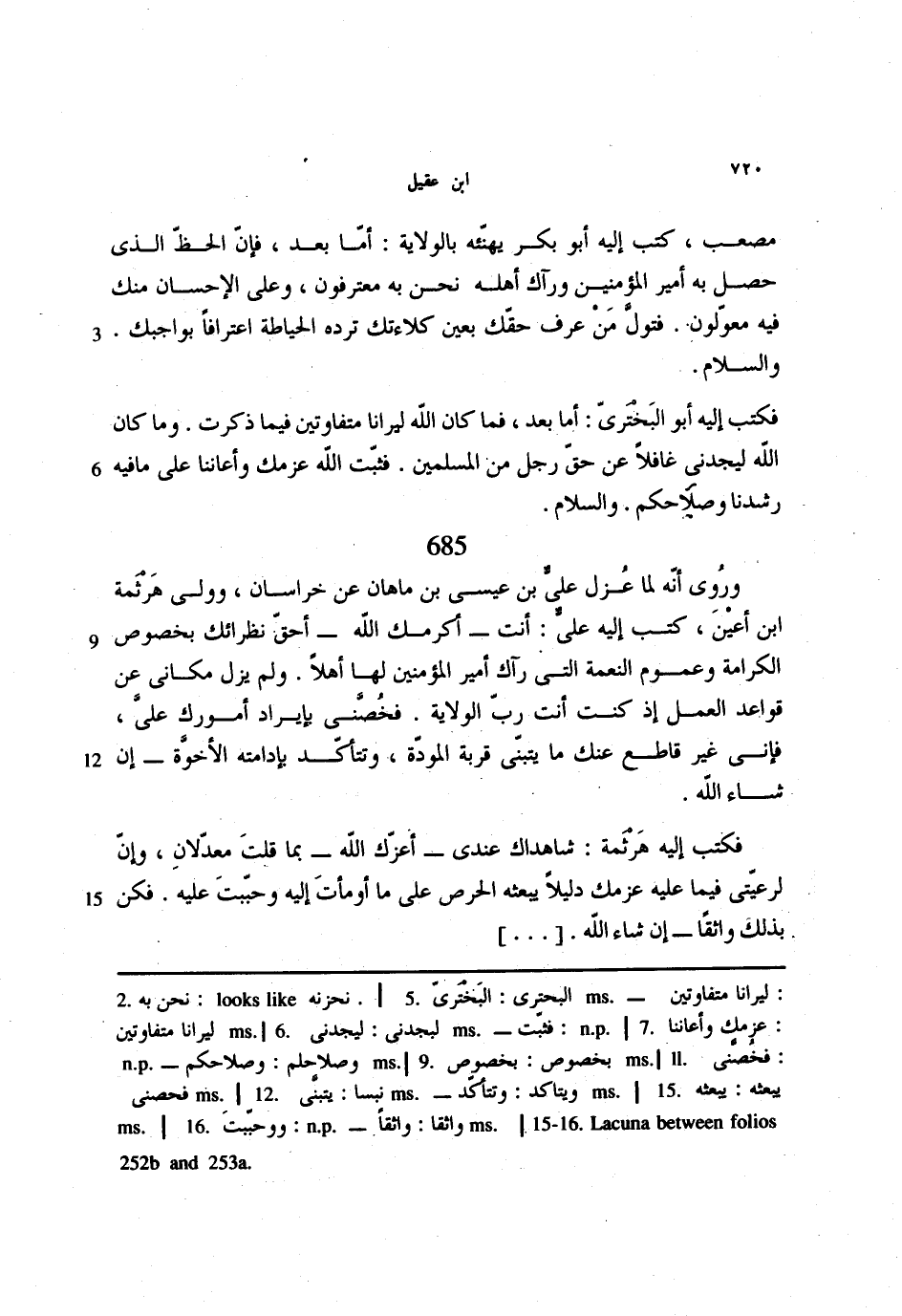 685 - وروى أنه لما عزل علي بن عيسى بن ماهان عن خراسان، وولى هرثمة ابن أعين، كتب إليه علي: أنت -أكرمك الله -أحق نظرائك بخصوص الكرامة وعموم النعمة التي رآك أمير المؤمنين لها أهلاً. ولم يزل مكاني عن قواعد العمل إذ كنت أنت رب الولاية. فخصني بإيراد أمورك علي، فإني غير قاطع عنك ما يتبنى قربة المودة، وتتأكد بإدامته الأخوة -إن شاء الله.