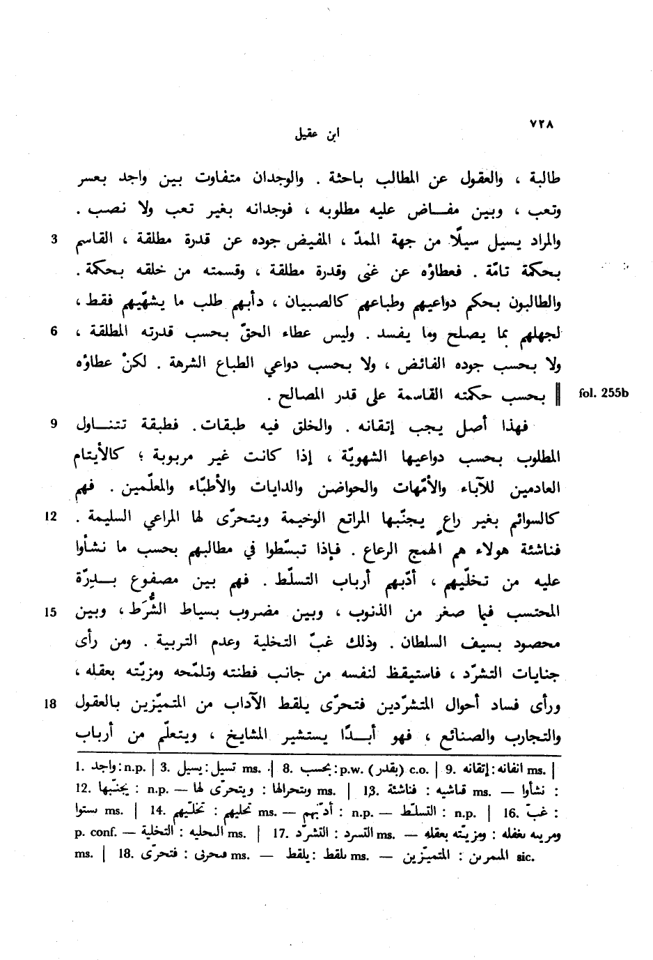 فهذا أصل يجب إتقانه. والخلق فيه طبقات. فطبقة تتناول المطلوب بحسب دواعيها الشهوية، إذا كانت غير مربوبة؛ كالأيتام العادمين للآباء والأمهات والحواضن والدايات والأطباء والمعلمين. فهم كالسوائم بغير راع يجنبها المراتع الوخيمة ويتحرى لها المراعي السليمة. فناشئة هؤلاء هم الهمج الرعاع. فإذا تبسطوا في مطالبهم بحسب ما نشأوا عليه من تخليهم، أدبهم أرباب التسلط. فهم بين مصفوع بدرة المحتسب فيما صغر من الذنوب، وبين مضروب بسياط الشروط، وبين محصود بسيف السلطان. وذلك غب التخلية وعدم التربية. ومن رأى جنايات التشرد، فاستيقظ لنفسه من جانب فطنته وتلمحه ومزيته بعقله، ورأى فساد أحوال المتشردين فتحرى يلقط الآداب من المتميزين بالعقول والتجارب والصنائع، فهو أبدًا يستشير المشايخ، ويتعلم من أرباب