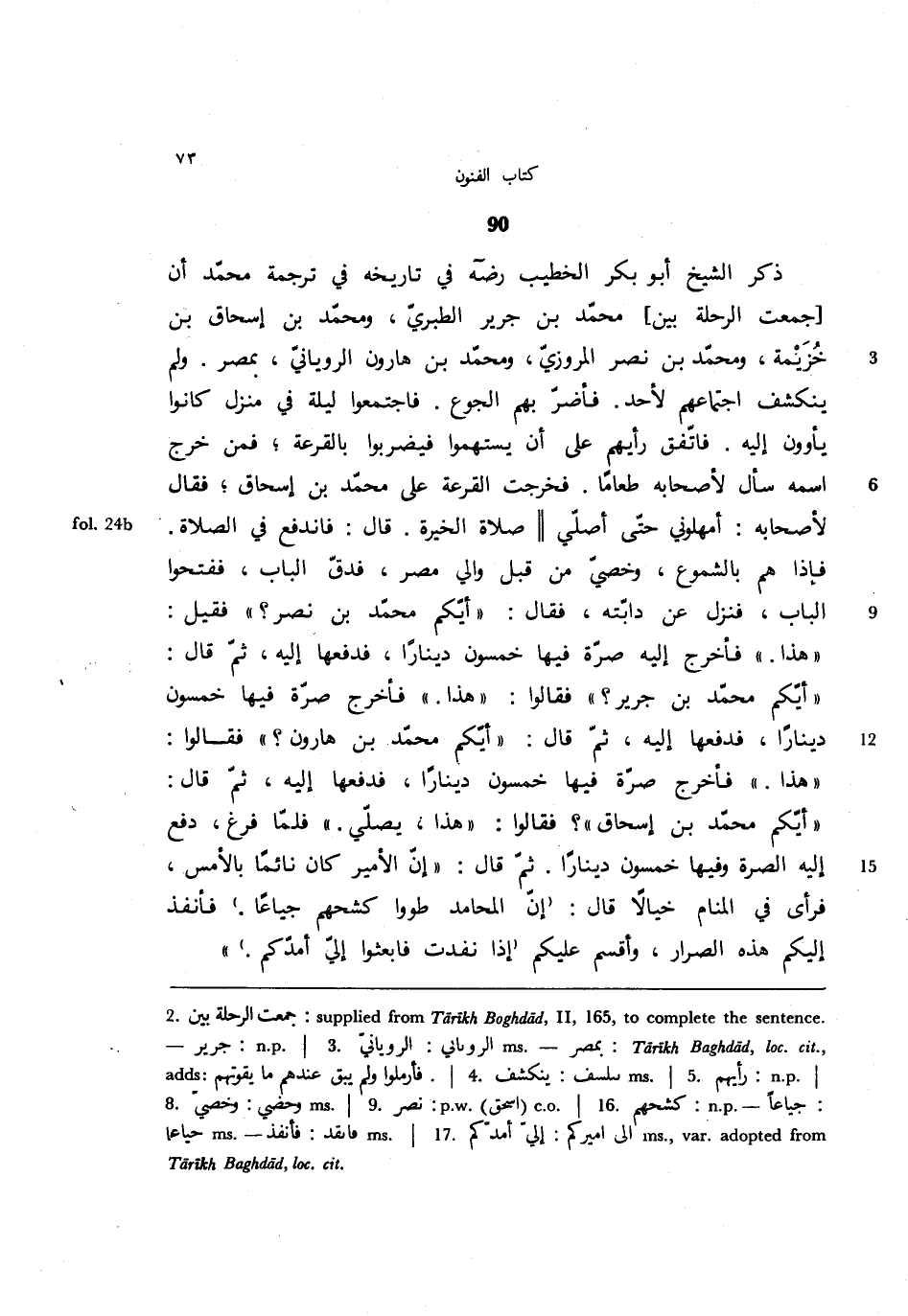 90 - ذكر الشيخ أبو بكر الخطيب رضه في تاريخه في ترجمة محمد أن [جمعت الرحلة بين] محمد بن جرير الطبري، ومحمد بن إسحاق بن خزيمة، ومحمد بن نصر المروزي، ومحمد بن هارون الروياني، بمصر. ولم ينكشف اجتماعهم لأحد. فأصر بهم الجوع. فاجتمعوا ليلة في منزل كانوا يأوون إليه. فاتفق رأيهم على أن يستهموا فيضربوا بالقرعة؛ فمن خرج اسمه سأل لأصحابه طعاماً. فخرجت القرعة على محمد بن إسحاق؛ فقال لأصحابه: أمهلوني حتى أصلي? صلاة الخير. قال: فاندفع في الصلاة. فإذا هي بالشموع، وخصي من قبل وإلى مصر، فدق الباب، ففتحوا الباب، فنزل عن دابته، فقال: ((أيكم محمد بن نصر؟ )) فقيل: ((هذا.)) فأخرج إليه صرة فيها خمسون ديناراً، فدفعها إليه، ثم قال: ((أيكم محمد بن جرير؟ )) فقالوا: ((هذا.)) فأخرج صرة فيها خمسون ديناراً، فدفعها إليه، ثم قال: ((أيكم محمد بن هارون؟ )) فقالوا: ((هذا.)) فأخرج صرة فيها خمسون ديناراً، فدفعها إليه، ثم قال: ((أيكم محمد بن إسحاق؟ )) فقالوا: ((هذا، يصلي.)) فلما فرغ، دفع إليه الصرة وفيها خمسون ديناراً. ثم قال: ((إن الأمير كان نائماً بالأمس، فرأى في المنام خيالاً قال: ((إن المحامد طووا كشحهم جياعاً)) فأنفد إليكم هذه الصرار، وأقسم عليكم ((إذا نفدت فأبعثوا إلى أمدكم))