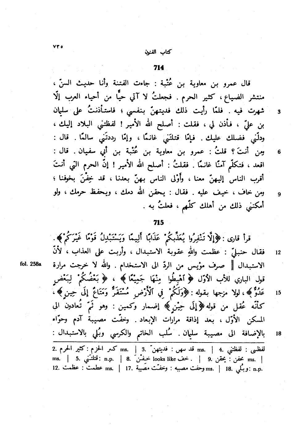 714 - قال عمرو بن معاوية بن عتبة: جاءت الفتنة وأنا حديث السن، منتشر الضياع، كثير الحرم. فجعلت لا آتي حيا من أحياء العرب إلا شهرت فيه. فلما رأيت ذلك فديتهن بنفسي؛ فاستأذنت على سليمان بن علي، فأذن لي، فقلت: أصلح الله الأمير! لفظتني البلاد إليك، ودلني فضلك عليك. فإما قتلتني غانمًا، وإما رددتني سالمًا. قال: ومن أنت؟ قلت: عمرو بن معاوية بن عتبة بن أبي سفيان. قال: اقعد، فتكلم آمنًا غانمًا. فقلت: أصلح الله الأمير! إن الحرم التي أنت أقرب الناس إليهن معنا، وأولى الناس بهن بعدنا، قد خفن بخوفنا؛ ومن خاف، خيف عليه. فقال: يحقن الله دمك، ويحفظ حرمك، ولو أمكنني ذلك من أهلك كلهم، فعلت به.