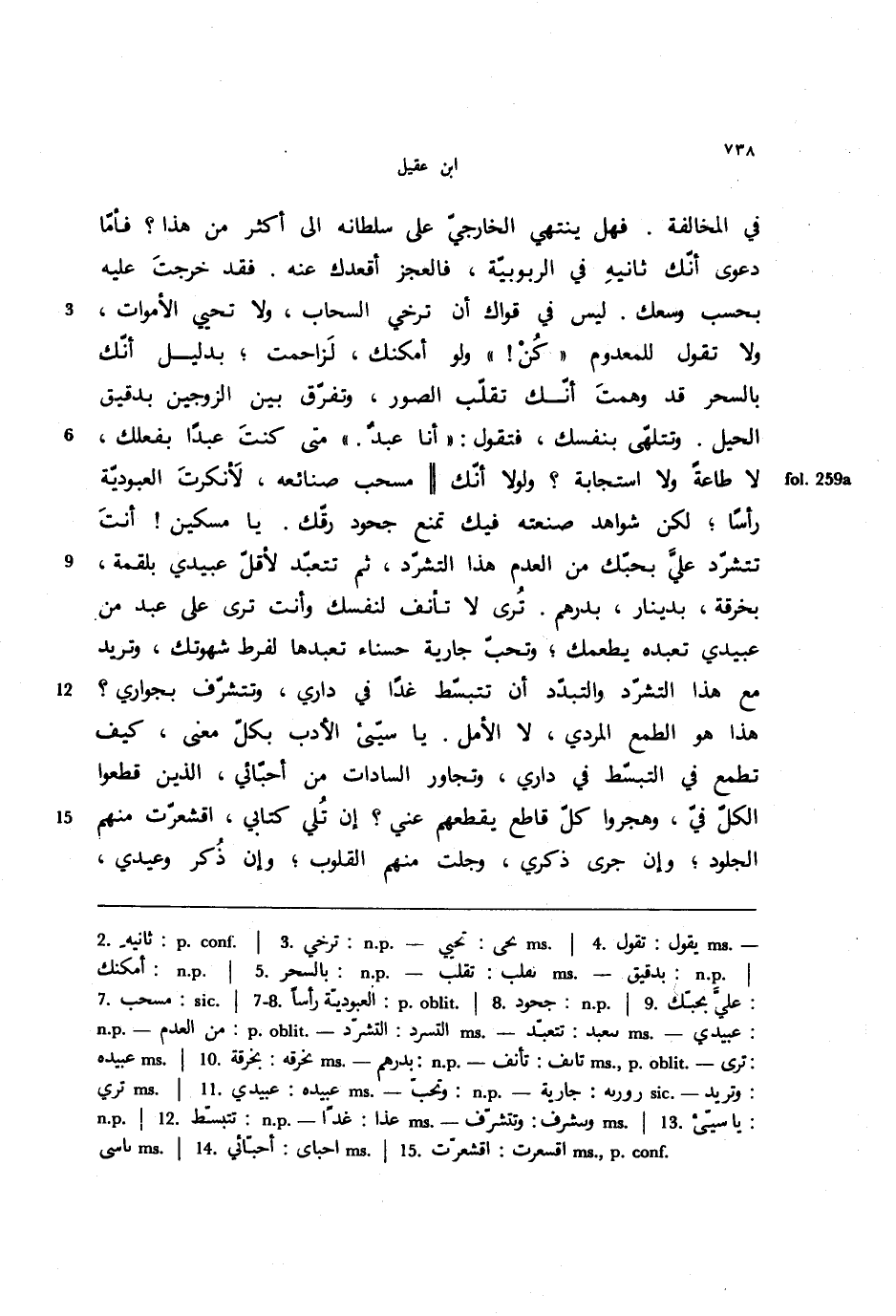 في المخالفة. فهل ينتهي الخارجي على سلطانه إلى أكثر من هذا؟ فأما دعوى أنك ثانيه في الربوبية، فالعجز أقعدك عنه. فقد خرجت عليه بحسب وسعك. ليس في قواك أن ترخي السحاب، ولا تحيي الأموات، ولا تقول للمعدوم ((كن! )) ولو أمكنك، لزاحمت، بدليل أنك بالسحر قد وهمت أنك تقلب الصور، وتفرق بين الزوجين بدقيق الحيل. وتتلهى بنفسك، فتقول: ((أنا عبدٌ.)) متى كنت عبدًا بفعلك، لا طاعةً ولا استجابة؟ ولولا أنك مسحب صنائعه، لأنكرت العبودية رأسًا، لكن شواهد صنعته فيك تمنع جحود رقك. يا مسكين! أنت تتشرد علي بحبك من العدم هذا التشرد، ثم تتعبد لأقل عبيدي بلقمة، بخرقة، بدينار، بدرهم. ترى لا تأنف لنفسك وأنت ترى على عبد من عبيدي تعبده يطعمك، وتحب جارية حسناء تعبدها لفرط شهوتك، وتريد مع هذا التشرد والتبدد أن تتبسط غدًا في داري، وتتشرف بجواري؟ هذا هو الطمع المردي، لا الأمل. يا سيئ الأدب بكل معنى، كيف تطمع في التبسط في داري، وتجاور السادات من أحبائي، الذين قطعوا الكل في، وهجروا كل قاطع يقطعهم عني؟ إن تلي كتابي، اقشعرت منهم الجلود، وإن جرى ذكري، وجلت منهم القلوب، وإن ذكر وعيدي،