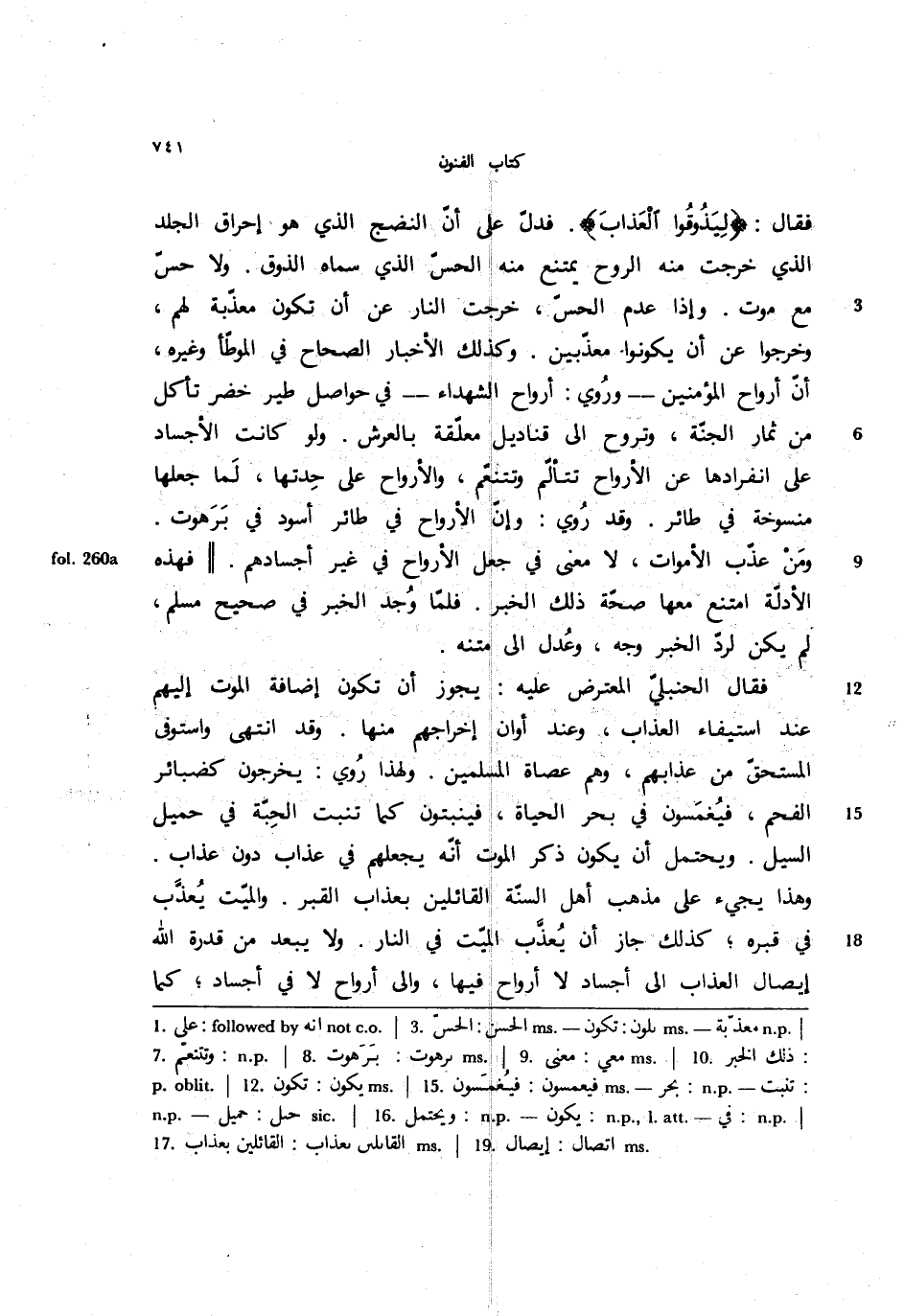 فقال الحنبلي المعترض عليه: يجوز أن تكون إضافة الموت إليهم عند استيفاء العذاب، وعند أوان إخراجهم منها. وقد انتهى واستوفى المستحق من عذابهم، وهم عصاة المسلمين. ولهذا روي: يخرجون كضبائر الفحم، فيغمسون في بحر الحياة، فينبتون كما تنبت الحبة في حميل السيل. ويحتمل أن يكون ذكر الموت أنه يجعلهم في عذاب دون عذاب. وهذا يجئ على مذهب أهل السنة القائلين بعذاب القبر. والميت يعذب في قبره، كذلك جاز أن يعذب الميت في النار. ولا يبعد من قدرة الله إيصال العذاب إلى أجساد لا أرواح فيها، وإلى أرواح لا في أجساد، كما