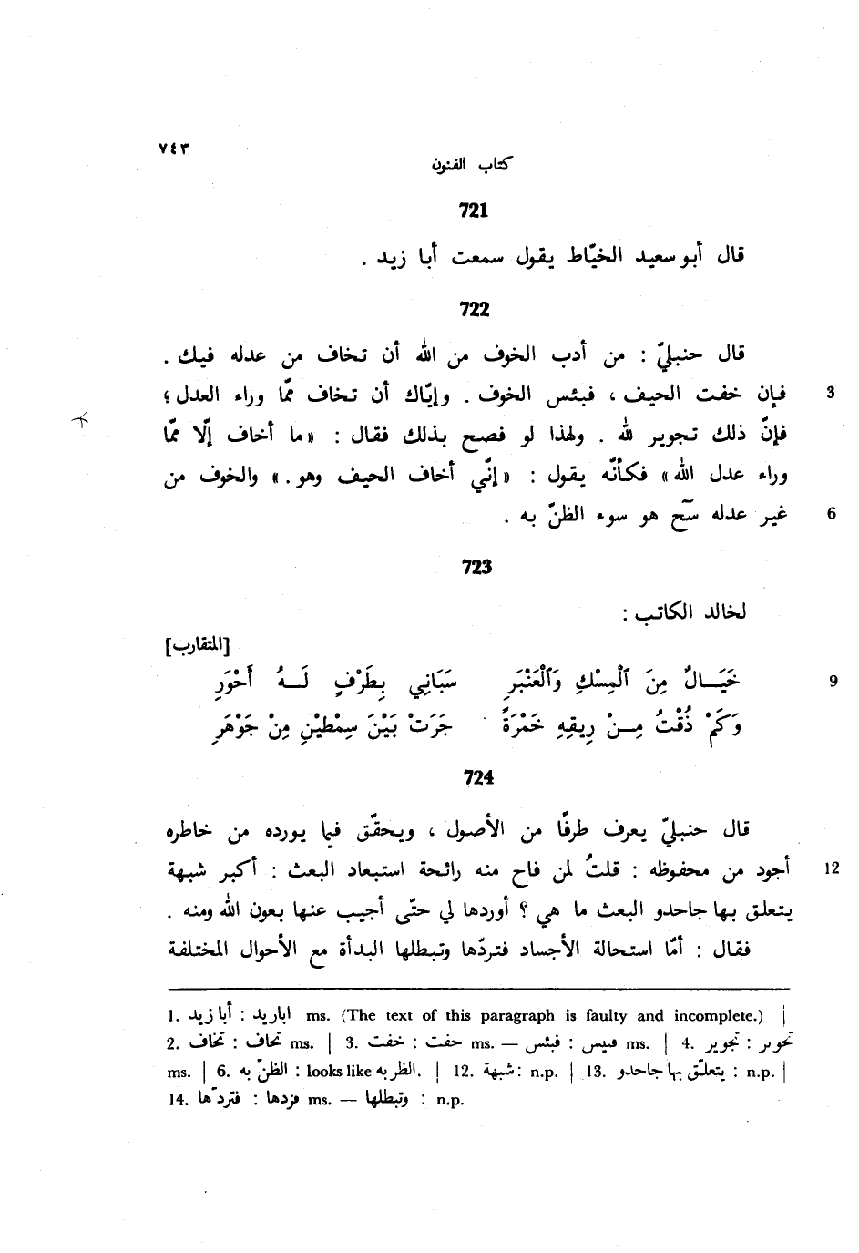 722 - قال حنبلي: من أدب الخوف من الله أن تخاف من عدله فيك. فإن خفت الحيف، فبئس الخوف. وإياك أن تخاف مما وراء العدل، فإن ذلك تجوير لله. ولهذا لو فصح بذلك فقال: ((ما أخاف إلا مما وراء عدل الله)) فكأنه يقول: ((إني أخاف الحيف وهو.)) والخوف من غير عدله سح هو سوء الظن به.