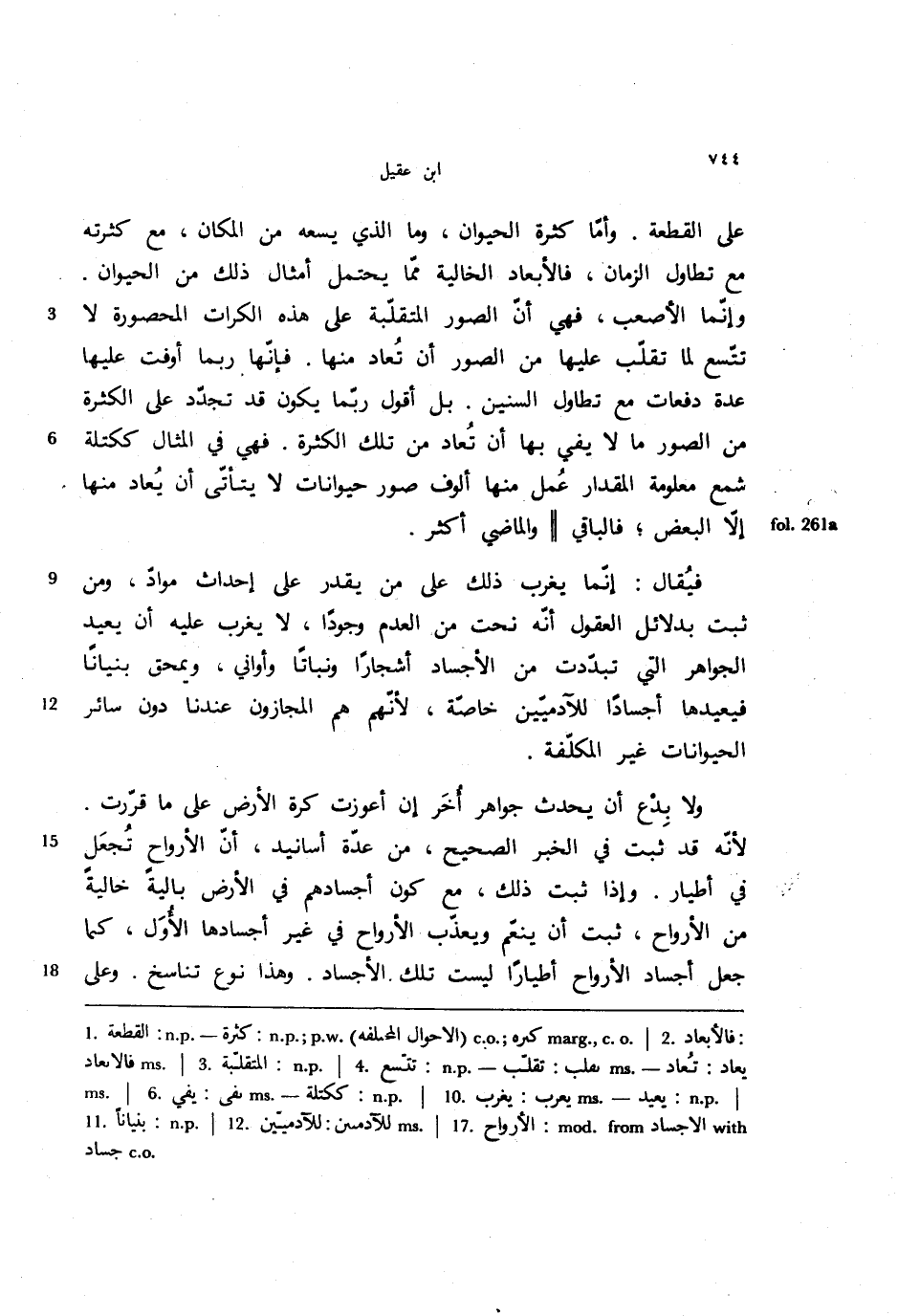 على القطعة. وأما كثرة الحيوان، وما الذي يسعه من المكان، مع كثرته مع تطاول الزمان، فالأبعاد الخالية مما يحتمل أمثال ذلك من الحيوان. وإنما الأصعب، فهي أن الصور المتقلبة على هذه الكرات المحصورة لا تتسع لما تقلب عليها من الصور أن تعاد منها. فإنها ربما أوفت عليها عدة دفعات مع تطاول السنين. بل أقول ربما يكون قد تجدد على الكثرة من الصور ما لا يفي بها أن تعاد من تلك الكثرة. فهي في المثال ككتلة شمع معلومة المقدار عمل منها ألوف صور حيوانات لا يتأتى أن يعاد منها إلا البعض، فالباقي والماضي أكثر.