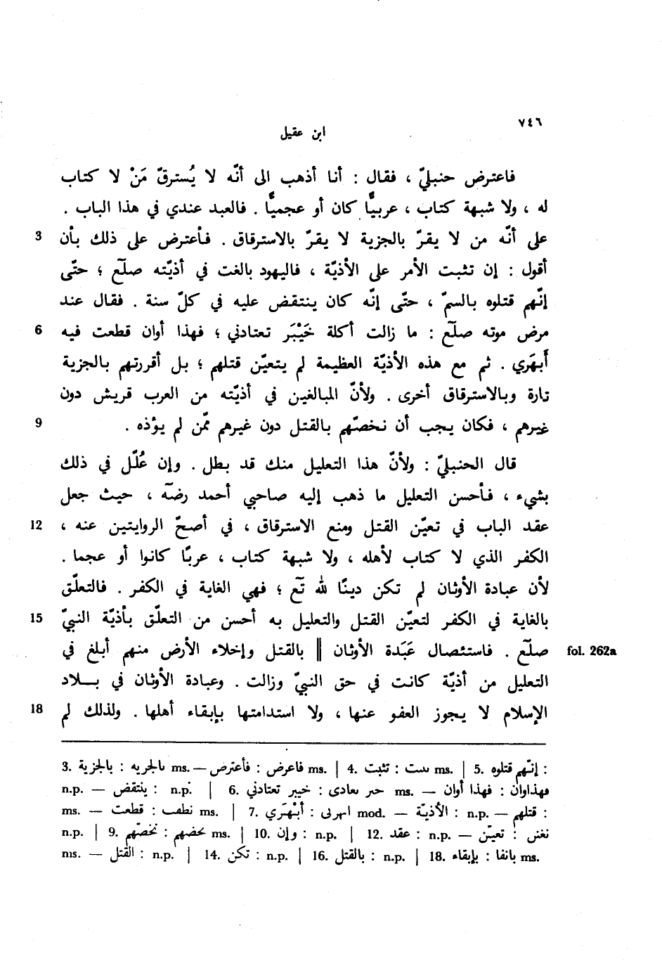 قال الحنبلي: ولأن هذا التعليل منك قد بطل. وإن علل في ذلك بشيء، فأحسن التعليل ما ذهب إليه صاحبي أحمد رضه، حيث جعل عقد الباب في تعين القتل ومنع الاسترقاق، في أصح الروايتين عنه، الكفر الذي لا كتاب لأهله، ولا شبهة كتاب، عربًا كانوا أو عجما. لأن عبادة الأوثان لم تكن دينًا لله تع، فهي الغاية في الكفر. فالتعلق بالغاية في الكفر لتعين القتل والتعليل به أحسن من التعلق بأذية النبي صلع. فاستئصال عبدة الأوثان بالقتل وإخلاء الأرض منهم أبلغ في التعليل من أذية كانت في حق النبي وزالت. وعبادة الأوثان في بلاد الإسلام لا يجوز العفو عنها، ولا استدامتها بإبقاء أهلها. ولذلك لم