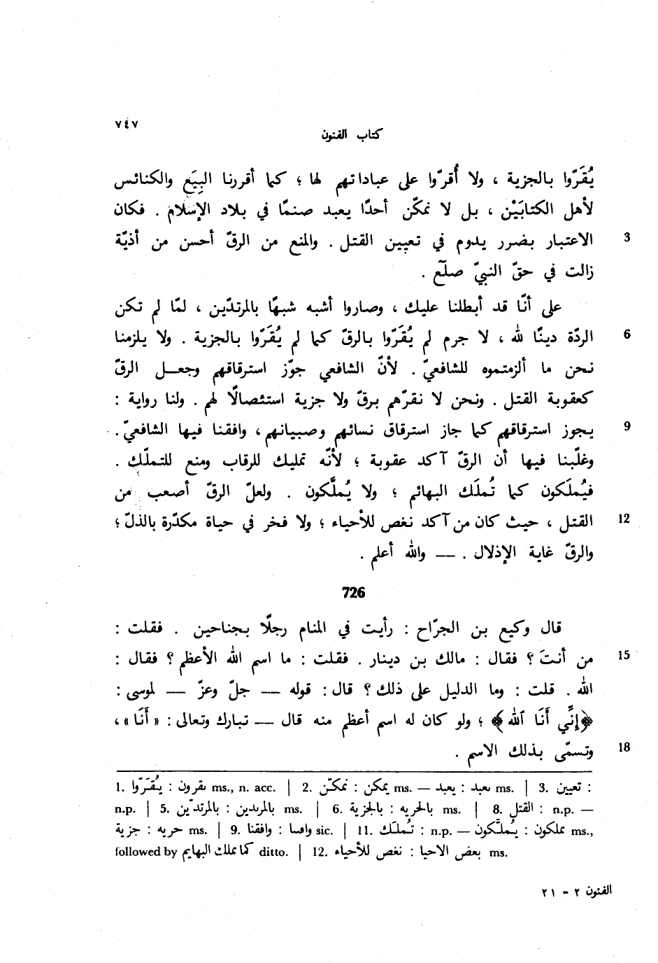 726 - قال وكيع بن الجراح: رأيت في المنام رجلًا بجناحين: فقلت: من أنت؟ فقال: مالك بن دينار. فقلت: ما اسم الله الأعظم؟ فقال: الله. قلت: وما الدليل على ذلك؟ قال: قوله- جل وعز- لموسى: {إني أنا الله}، ولو كان له اسم أعظم منه قال- تبارك وتعالى: ((أنا))، وتسمى بذلك الاسم.