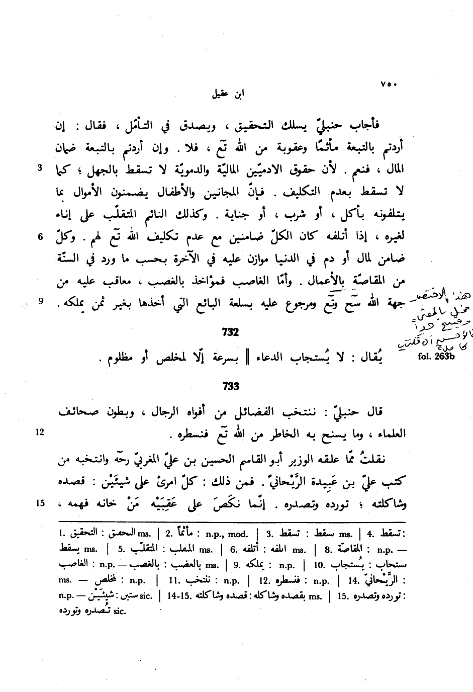 733 - قال حنبلي: ننتخب الفضائل من أفواه الرجال، وبطون صحائف العلماء، وما يسنح به الخاطر من الله تع فنسطره.