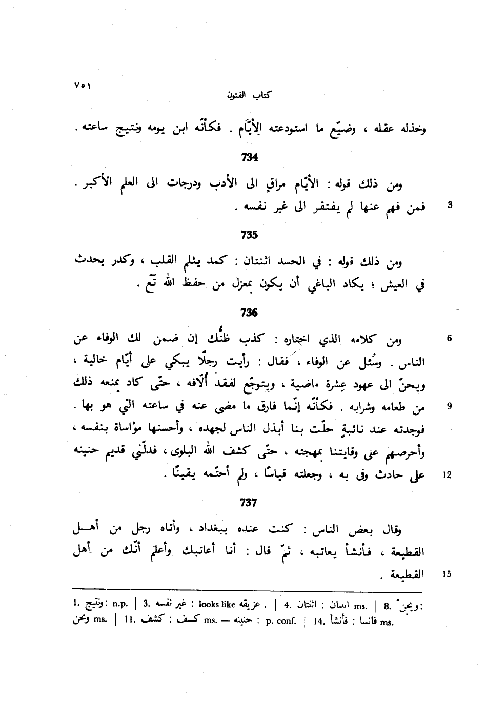 734 - ومن ذلك قوله: الأيام مراقٍ إلى الأدب ودرجات إلى العلم الأكبر. فمن فهم عنها لم يفتقر إلى غير نفسه.