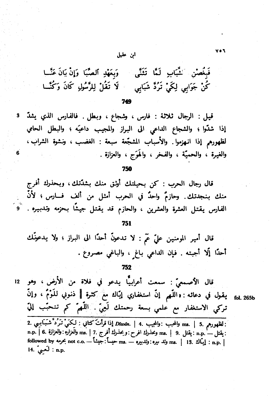 749 - قيل: الرجال ثلاثة: فارس، وشجاع، وبطل. فالفارس الذي يشد إذا شدوا، والشجاع الداعي إلى البراز والجيب داعيه، والبطل الحامي لظهورهم إذا انهزموا. والأسباب المشجعة سبعة: الغضب، ونشوة السراب، والغيرة، والحمية، والفخر، والهوج، والعزازة.