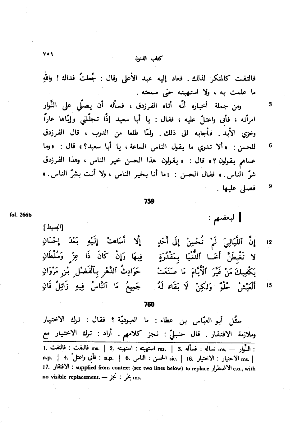 760 - سئل أبو العباس بن عطاء: ما العبودية؟ فقال: ترك الاختيار وملازمة الافتقار. قال حنبلي: نجز كلامهم. أراد: ترك الاختيار مع