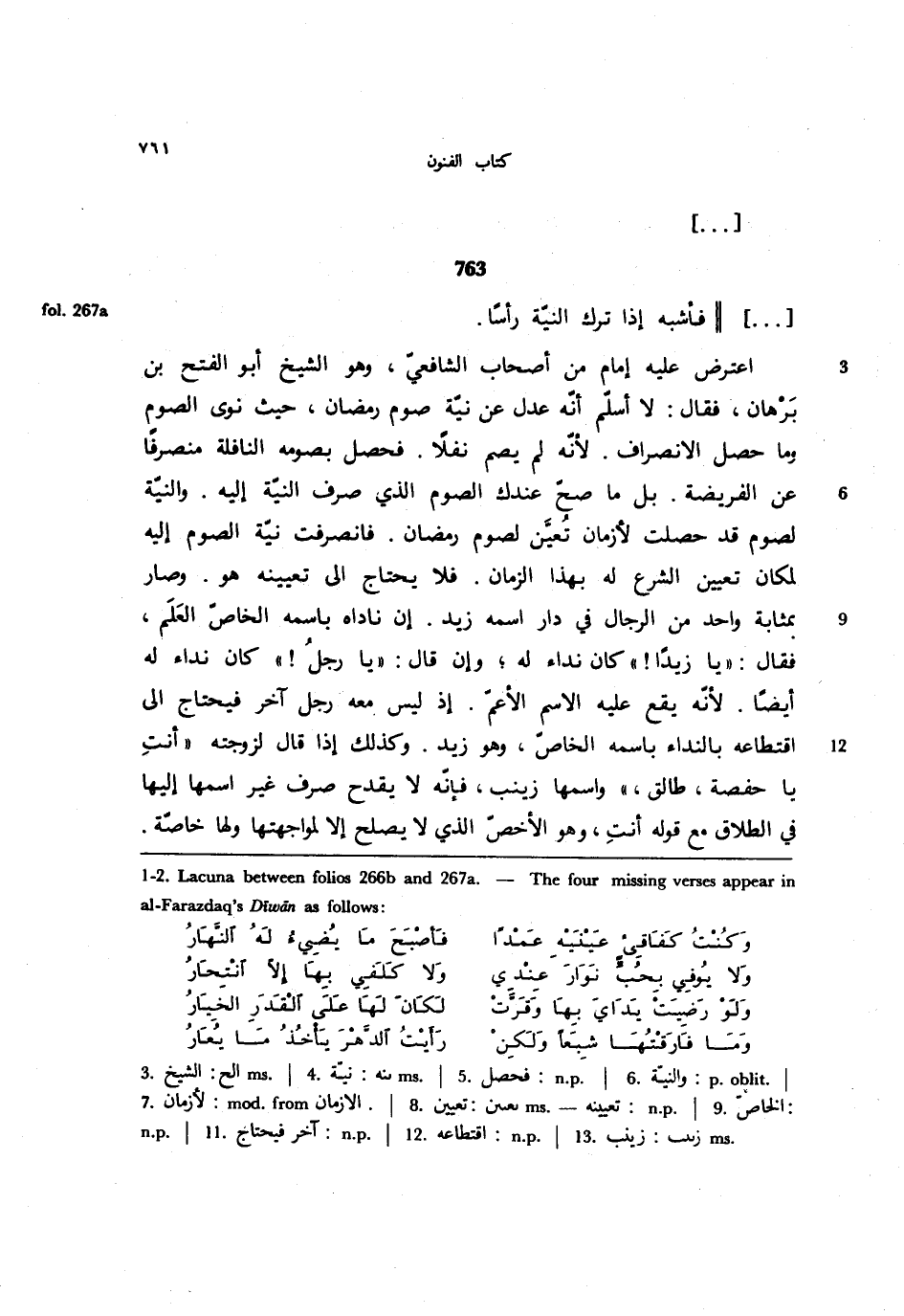 اعترض عليه إمام من أصحاب الشافعي، وهو الشيخ أبو الفتح بن برهان، فقال: لا أسلم أنه عدل عن نية صوم رمضان، حيث نوى الصوم وما حصل الانصراف. لأنه لم يصم نفلًا. فحصل بصومه النافلة منصرفًا عن الفريضة. بل ما صح عندك الصوم الذي صرف النية إليه. والنية لصوم قد حصلت لأزمان تعين لصوم رمضان. فانصرفت نية الصوم إليه لمكان تعيين الشرع له بهذا الزمان. فلا يحتاج إلى تعيينه هو. وصار بمثابة واحد من الرجال في دار اسمه زيد. إن ناداه باسمه الخاص العلم، فقال: ((يا زيدًا! )) كان نداء له، وإن قال: ((يا رجل! )) كان نداء له أيضًا. لأنه يقع عليه الاسم الأعم. إذ ليس معه رجل آخر فيحتاج إلى اقتطاعه بالنداء باسمه الخاص، وهو زيد. وكذلك إذا قال لزوجته ((أنت يا حفصة، طالق، )) واسمها زينب، فإنه لا يقدح صرف غير اسمها إليها في الطلاق مع قوله أنت، وهو الأخص الذي لا يصلح إلا لمواجهتها ولها خاصة.