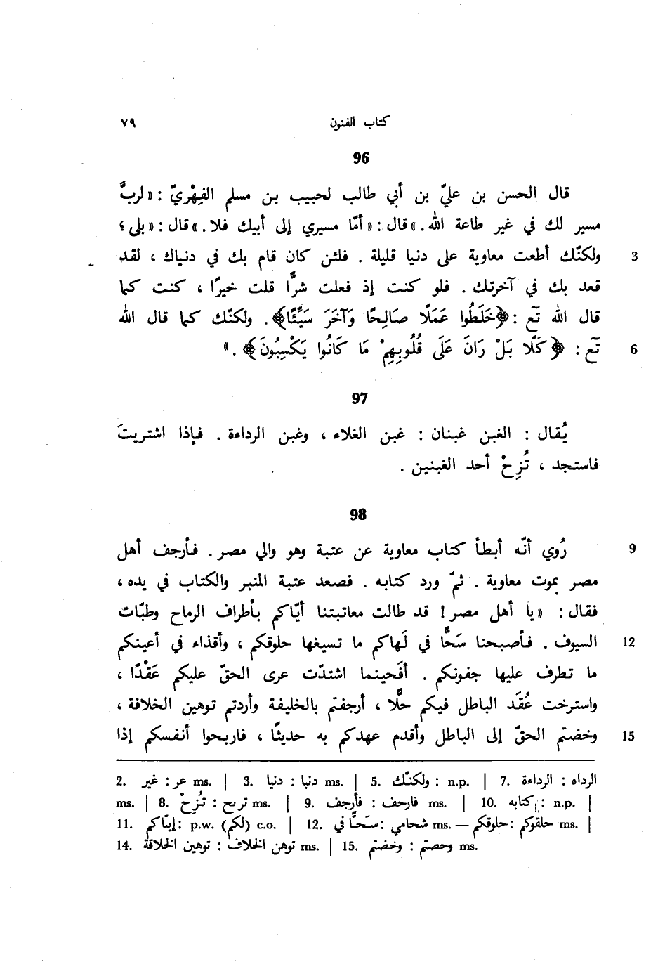 96 - قال الحسن بن علي بن أبي طالب لحبيب بن مسلم الفهري: "لرب مسير لك في غير طاعة الله." قال: "أما مسيري إلى أبيك فلا." قال: "بلى؛ ولكنك أطعت معاوية على دنيا قليلة. فلئن كان قام بك في دنياك، لقد قعد بك في آخرتك. فلو كنت إذ فعلت شرًا قلت خيرًا، كنت كما قال الله تع: {خلطوا عملاً صالحًا وآخر سيئًا}. ولكنك كما قال الله تع: {كلا بل ران على قلوبهم ما كانوا يكسبون}.