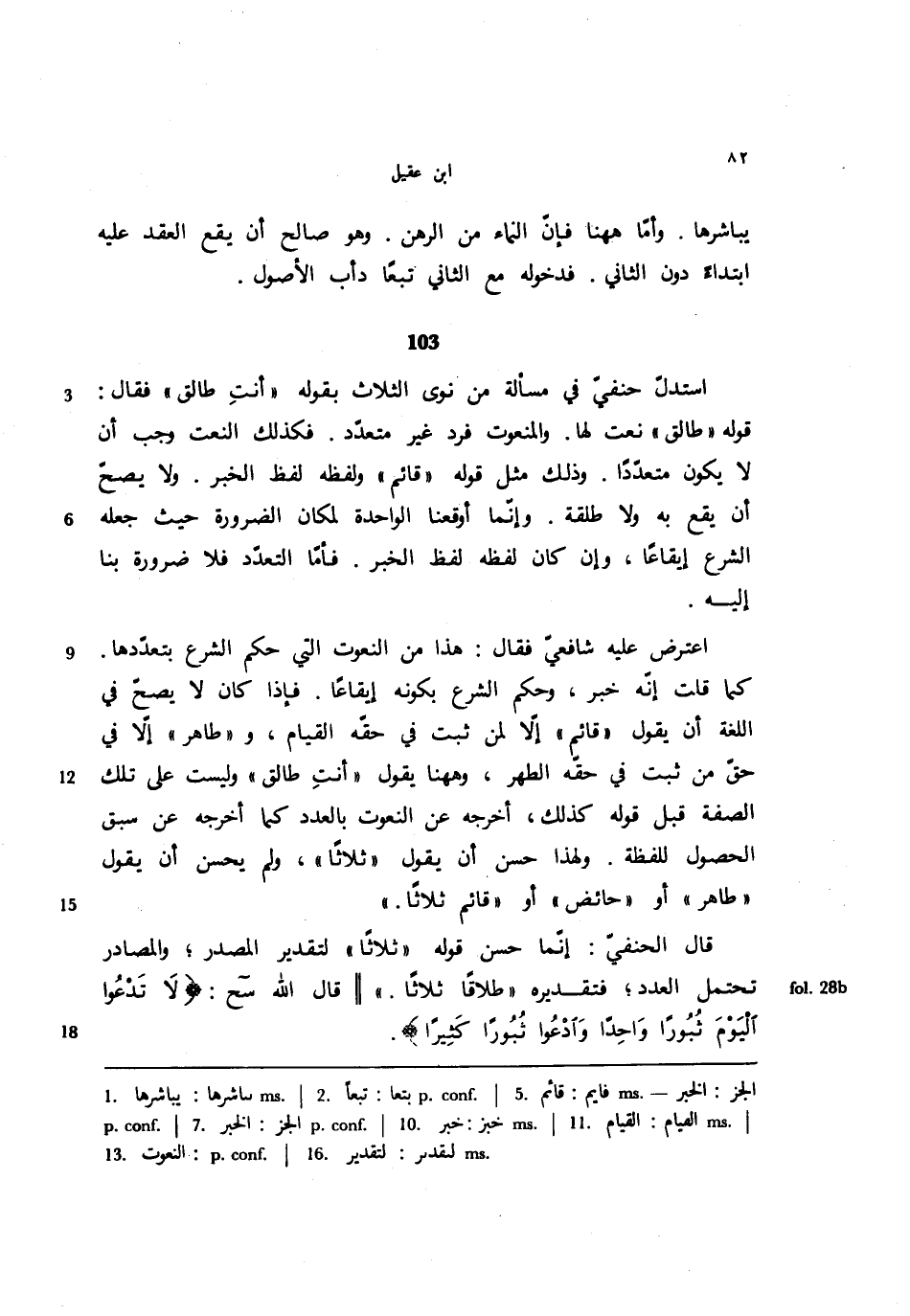 103 - استدل حنفي في مسألة من نوى الثلاث بقوله "أنت طالق" فقال: قوله "طالق" نعت لها. والمنعوت فرد غير متعدد. فكذلك النعت وجب أن لا يكون متعددًا. وذلك مثل قوله "قائم" ولفظه لفظ الخبر. ولا يصح أن يقع به ولا طلقة. وإنما أوقعنا الواحدة لمكان الضرورة حيث جعله الشرع إيقاعًا، وإن كان لفظه لفظ الخبر. فأما التعدد فلا ضرورة بنا إليه.