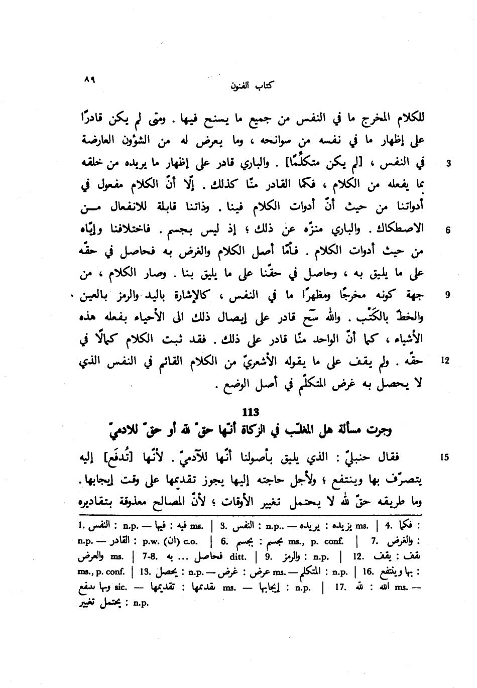 للكلام المخرج ما في النفس من جميع ما يسنح فيها. ومتى لم يكن قادرًا على إظهار ما في نفسه من سوانحه، وما يعرض له من الشؤون العارضة في النفس، [لم يكن متكلمًا]. والباري قادر على إظهار ما يريده من خلقه بما يفعله من الكلام، فكما القادر منا كذلك. إلا أن الكلام مفعول في أدواتنا من حيث أن دوات الكلام فينا. وذاتنا قابلة للانفعال من الاصطكاك. والباري منزه عن ذلك؛ إذ ليس بجسم. فاختلافنا وإياه من حيث أدوات الكلام. فأما أصل الكلام والغرض به فحاصل في حقه على ما يليق به، وحاصل في حقنا على ما يليق بنا. وصار الكلام، من جهة كونه مخرجًا ومظهرًا ما في النفس، كالإشارة باليد والرمز بالعين. والخط بالكتب. والله سح قادر على إيصال ذلك إلى الأحياء بفعله هذه الأشياء، كما أن الواحد منا قادر على ذلك. فقد ثبت الكلام كمالاً في حقه. ولم يقف على ما يقوله الأشعري من الكلام القائم في النفس الذي لا يحصل به غرض المتكلم في أصل الوضع.