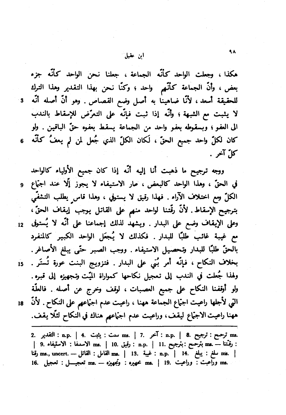 هكذا، وجعلت الواحد كأنه الجماعة، جعلنا نحن الواحد كأنه جزء بعض، وأن الجماعة كأنهم واحد؛ وكنا نحن بهذا التقدير وهذا الترك للحقيقة أسعد، لأنا ضاهينا به أصل وضع القصاص. وهو أن أصله أنه لا يثبت مع الشبهة؛ وأنه إذا ثبت فإنه على التعرض للإسقاط بالندب إلى العفو؛ وبسقوطه بعفو واحد من الجماعة يسقط بعفوه حق الباقين. ولو كان لكل واحد جميع الحق، لكان الكل الذي جعل لمن لم يعف كأنه كل آخر.
