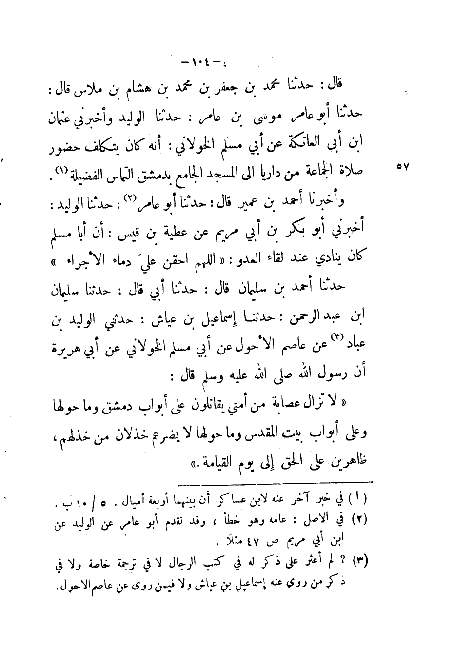 حَدَّثَنَا أَحْمَدُ بْنُ سُلَيْمَانَ، قَالَ: حَدَّثَنَا أَبِي، قَالَ: حَدَّثَنَا سُلَيْمَانُ بْنُ عَبْدِ الرَّحْمَنِ، حَدَّثَنَا إِسْمَاعِيلُ بْنُ عَيَّاشٍ، حَدَّثَنَا الْوَلِيدُ بْنُ عَبَّادٍ، عَنْ عَاصِمٍ الْأَحْوَلِ، عَنْ أَبِي مُسْلِمٍ الْخَوْلَانِيِّ، عَنْ أَبِي هُرَيْرَةَ، أَنَّ رَسُولَ اللَّهِ صَلَّى اللَّهُ عَلَيْهِ وَسَلَّمَ قَالَ: §«لَا تَزَالُ عِصَابَةٌ مِنْ أُمَّتِي يُقَاتِلُونَ عَلَى أَبْوَابِ دِمَشْقَ وَمَا حَوْلَهَا، وَعَلَى أَبْوَابِ بَيْتِ الْمَقْدِسِ وَمَا حَوْلَهَا، لَا يَضُرُّهُمْ خِذْلَانُ مَنْ خَذَلَهُمْ، ظَاهِرِينَ عَلَى الْحَقِّ إِلَى يَوْمِ الْقِيَامَةِ»