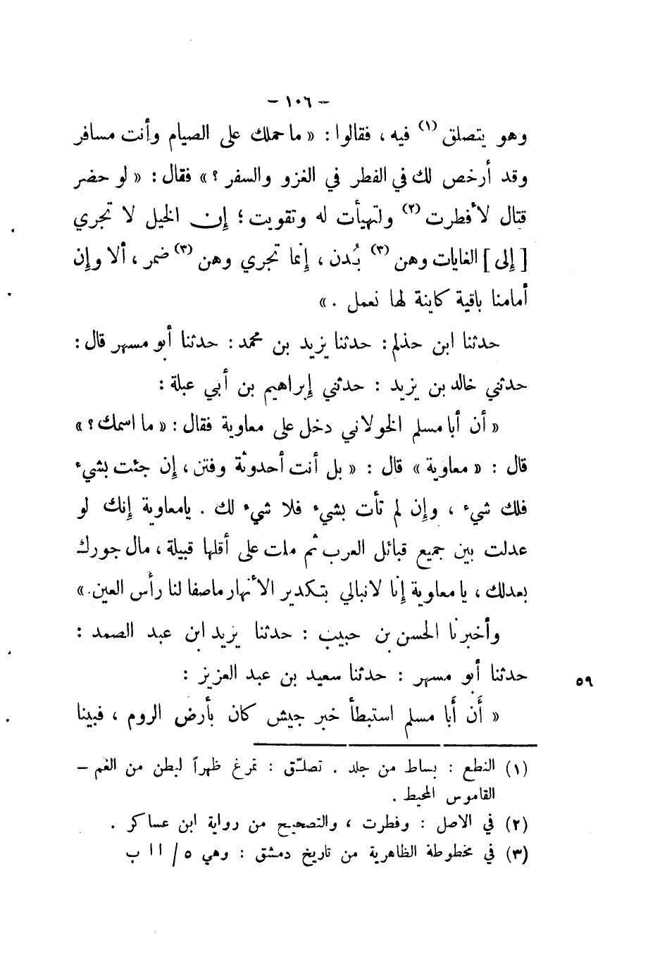حَدَّثَنَا ابْنُ حَذْلَمٍ، أَنْبَأَنَا يَزِيدُ بْنُ مُحَمَّدٍ، حَدَّثَنَا أَبُو مُسْهِرٍ، قَالَ: حَدَّثَنِي خَالِدُ بْنُ يَزِيدَ، حَدَّثَنِي إِبْرَاهِيمُ بْنُ أَبِي عَبْلَةَ، أَنَّ أَبَا مُسْلِمٍ الْخَوْلَانِيَّ، دَخَلَ عَلَى مُعَاوِيَةَ فَقَالَ: «مَا اسْمُكَ» ؟ قَالَ: مُعَاوِيَةُ، قَالَ: «بَلْ أَنْتَ §أُحْدُوثَةٌ وَفِتَنٌ، إِنْ جِئْتَ بِشَيْءٍ فَلَكَ شَيْءٌ، وَإِنْ لَمْ تَأْتِ بِشَيْءٍ فَلَا شَيْءَ لَكَ يَا مُعَاوِيَةُ، إِنَّكَ لَوْ عَدَلْتَ بَيْنَ جَمِيعِ قَبَائِلِ الْعَرَبِ ثُمَّ مِلْتَ عَلَى أَقَلِّهِمْ قَبِيلَةً مَالَ جَوْرُكَ بِعَدْلِكَ، يَا مُعَاوِيَةُ، إِنَّا لَا نُبَالِي بِتَكَدُّرِ الْأَنْهَارِ مَا صَفَا لَنَا رَأْسُ الْعَيْنِ»