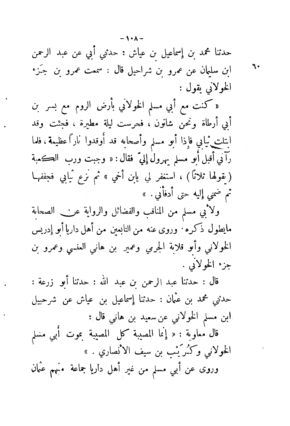 قَالَ: حَدَّثَنَا عَبْدُ الرَّحْمَنِ بْنُ عَبْدِ اللَّهِ، حَدَّثَنَا أَبُو زُرْعَةَ، حَدَّثَنِي مُحَمَّدُ بْنُ عُثْمَانَ، حَدَّثَنَا إِسْمَاعِيلُ بْنُ عَيَّاشٍ، عَنْ شُرَحْبِيلَ بْنِ مُسْلِمٍ الْخَوْلَانِيِّ، عَنْ سَعِيدِ بْنِ هَانِئٍ، قَالَ: قَالَ مُعَاوِيَةُ: «إِنَّمَا §الْمُصِيبَةُ كُلُّ الْمُصِيبَةِ بِمَوْتِ أَبِي مُسْلِمٍ الْخَوْلَانِيِّ وَكُرَيْبِ بْنِ سَيْفٍ الْأَنْصَارِيِّ» وَرَوَى عَنْ أَبِي مُسْلِمٍ مِنْ غَيْرِ أَهْلِ دَارِيَّا جَمَاعَةٌ مِنْهُمْ عُثْمَانُ -[109]- بْنُ أَبِي الْعَاتِكَةِ، وَعَاصِمٌ الْأَحْوَلُ، وَأَبُو الْعَالِيَةَ، وَعَطَاءٌ، وَفُرَاتُ بْنُ ثَعْلَبَةَ، وَضَمْرَةُ بْنُ حَبِيبٍ، وَإِبْرَاهِيمُ بْنُ أَبِي عَبْلَةَ، وَعَطِيَّةُ بْنُ قَيْسٍ، وَسَعِيدُ بْنُ عَبْدِ الْعَزِيزِ مُرْسِلًا، وَكَعْبُ الْأَحْبَارِ، وَغَيْرُهُمْ وَلَوْ ذَهَبْتُ إِلَى ذِكْرِ أَحَادِيثِهِمْ وَمَا نَقَلَ كُلُّ وَاحِدٍ مِنْهُمْ عَنْهُ لَطَالَ ذَلِكَ وَاتَّسَعَ الْأَمْرُ فِيهِ، إِلَّا أَنَّا اقْتَصَرْنَا عَلَى ذِكْرِ بَعْضِ مَنَاقِبِهِ دُونَ الْمُسْنَدِ مِنْ حَدِيثِهِ، وَبِاللَّهِ التَّوْفِيقُ