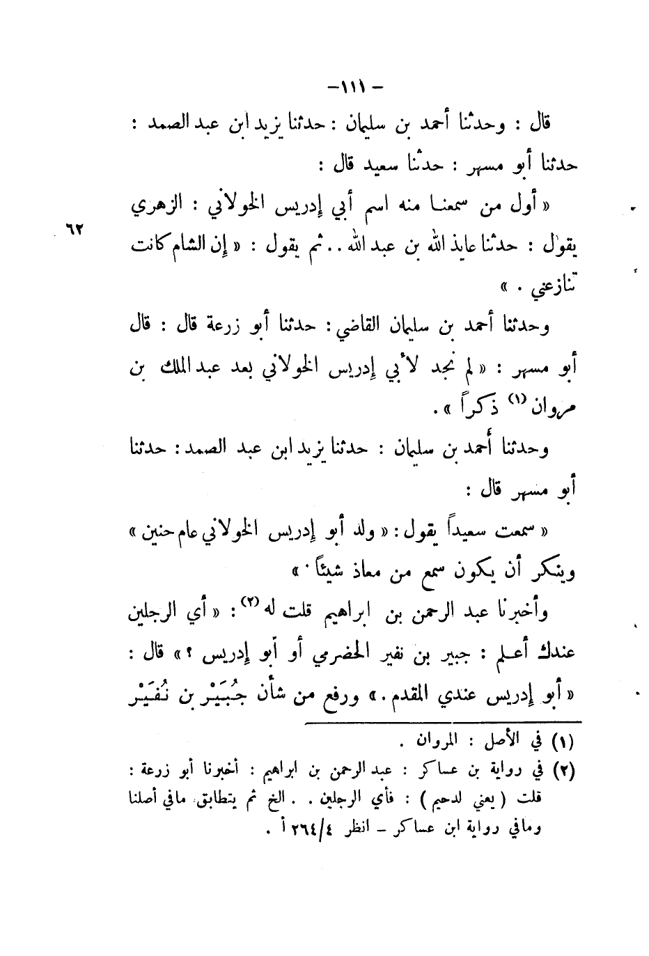 حَدَّثَنَا أَحْمَدُ بْنُ سُلَيْمَانَ الْقَاضِي، حَدَّثَنَا أَبُو زُرْعَةَ، قَالَ: قَالَ أَبُو مُسْهِرٍ: §«لَمْ نَجِدْ لِأَبِي إِدْرِيسَ الْخَوْلَانِيِّ بَعْدَ عَبْدِ الْمَلِكِ بْنِ مَرْوَانَ ذِكْرًا»