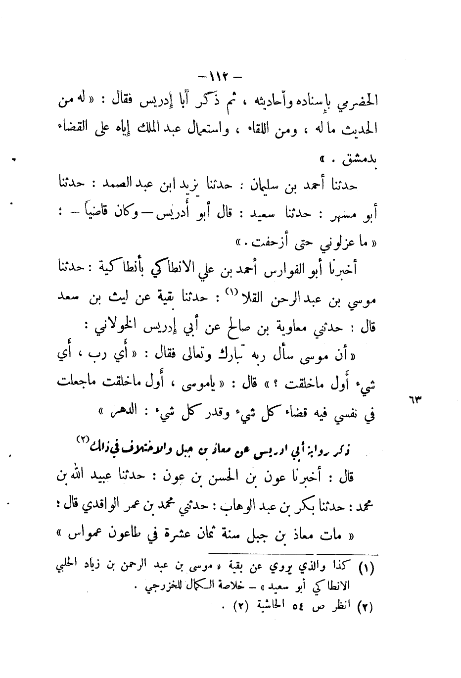 أَخْبَرَنَا أَبُو الْفَوَارِسِ أَحْمَدُ بْنُ عَلِيٍّ الْأَنْطَاكِيُّ بِأَنْطَاكِيَةَ، حَدَّثَنَا مُوسَى بْنُ عَبْدِ الرَّحْمَنِ الْقَلَّا، حَدَّثَنَا بَقِيَّةُ، عَنْ لَيْثِ بْنِ سَعْدٍ، قَالَ: حَدَّثَنِي مُعَاوِيَةُ بْنُ صَالِحٍ، عَنْ أَبِي إِدْرِيسَ الْخَوْلَانِيِّ، أَنَّ مُوسَى سَأَلَ رَبَّهُ تَبَارَكَ وَتَعَالَى فَقَالَ: أَيْ رَبِّ، أَيُّ شَيْءٍ أَوَّلُ مَا خَلَقْتَ؟ قَالَ: يَا مُوسَى §أَوَّلُ مَا خَلَقْتُ مَا جَعَلْتُ فِي نَفْسِي فِيهِ قَضَاءَ كُلِّ شَيْءٍ وَقَدْرَ كُلِّ شَيْءٍ: الدَّهْرُ "