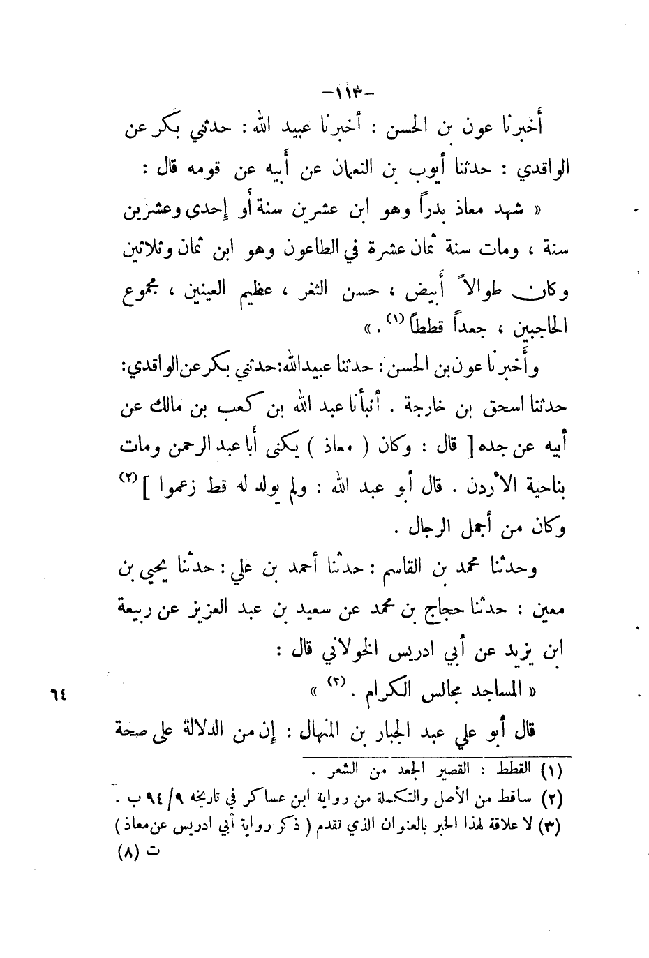 وَحَدَّثَنَا مُحَمَّدُ بْنُ الْقَاسِمِ، حَدَّثَنَا أَحْمَدُ بْنُ عَلِيٍّ، حَدَّثَنَا يَحْيَى بْنُ مَعِينٍ، حَدَّثَنَا حَجَّاجُ بْنُ مُحَمَّدٍ، عَنْ سَعِيدِ بْنِ عَبْدِ الْعَزِيزِ، عَنْ رَبِيعَةَ بْنِ يَزِيدَ، عَنْ أَبِي إِدْرِيسَ الْخَوْلَانِيِّ، قَالَ: §«الْمَسَاجِدُ مَجَالِسُ الْكِرَامِ» قَالَ أَبُو عَلِيٍّ عَبْدُ الْجَبَّارِ بْنُ الْمُهَنَّا: إِنَّ مِنَ الدَّلَالَةِ عَلَى صِحَّةِ -[114]- رِوَايَةِ أَبِي إِدْرِيسَ عَنْ مُعَاذٍ، وَلُقْيِهِ إِيَّاهُ، أَنَّ مُعَاذَ بْنَ جَبَلٍ وَأَبَا عُبَيْدَةَ بْنَ الْجَرَّاحِ مَاتَا فِي عَامٍ وَاحِدٍ رَضِيَ اللَّهُ عَنْهُمَا