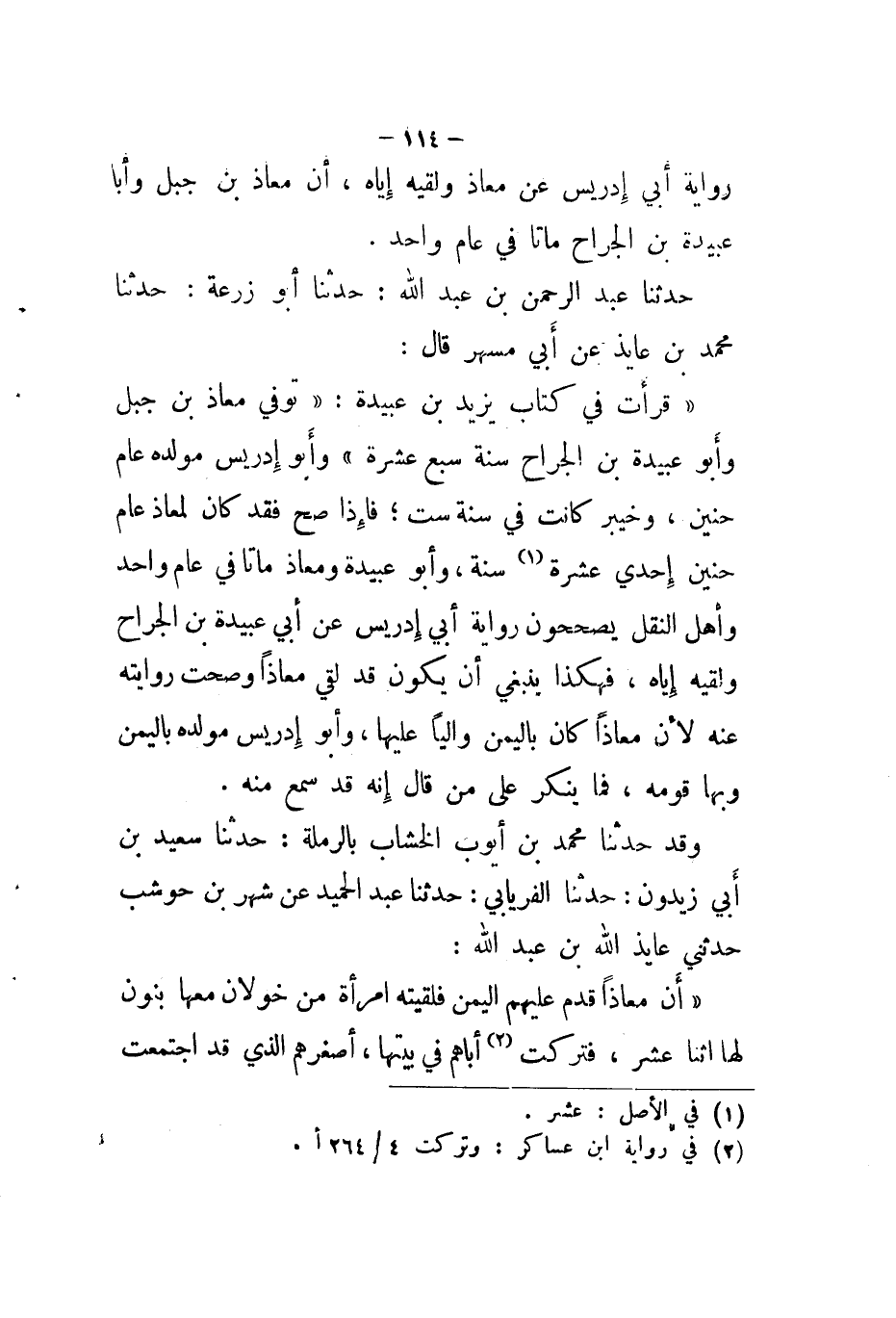 حَدَّثَنَا عَبْدُ الرَّحْمَنِ بْنُ عَبْدِ اللَّهِ، حَدَّثَنَا أَبُو زُرْعَةَ، حَدَّثَنَا مُحَمَّدُ بْنُ عَائِذٍ، عَنْ أَبِي مُسْهِرٍ، قَالَ: قَرَأْتُ فِي كِتَابِ يَزِيدَ بْنِ عُبَيْدَةَ: §«تُوُفِّيَ مُعَاذُ بْنُ جَبَلٍ وَأَبُو عُبَيْدَةَ بْنُ الْجَرَّاحِ سَنَةَ سَبْعَ عَشْرَةَ» وَأَبُو إِدْرِيسَ مَوْلِدُهُ عَامَ حُنَيْنٍ، وَحُنَيْنٌ كَانَتْ فِي سَنَةِ سِتٍّ، فَإِذَا صَحَّ فَقَدْ كَانَ لِمُعَاذٍ عَامَ حُنَيْنٍ إِحْدَى عَشْرَةَ سَنَةً، وَأَبُو عُبَيْدَةَ وَمُعَاذٌ مَاتَا فِي عَامٍ وَاحِدٍ، وَأَهْلُ النَّقْلِ يُصَحِّحُونَ رِوَايَةَ أَبِي إِدْرِيسَ عَنْ أَبِي عُبَيْدَةَ بْنِ الْجَرَّاحِ وَلُقْيِهِ إِيَّاهُ، فَهَكَذَا يَنْبَغِي أَنْ يَكُونَ قَدْ لَقِيَ مُعَاذًا وَصَحَّتْ رِوَايَتُهُ عَنْهُ، لِأَنَّ مُعَاذًا كَانَ بِالْيَمَنِ وَالِيًا عَلَيْهَا، وَأَبُو إِدْرِيسَ مَوْلِدُهُ بِالْيَمَنِ وَبِهَا قَوْمُهُ، فَمَا يُنْكَرُ عَلَى مَنْ قَالَ إِنَّهُ قَدْ سَمِعَ مِنْهُ