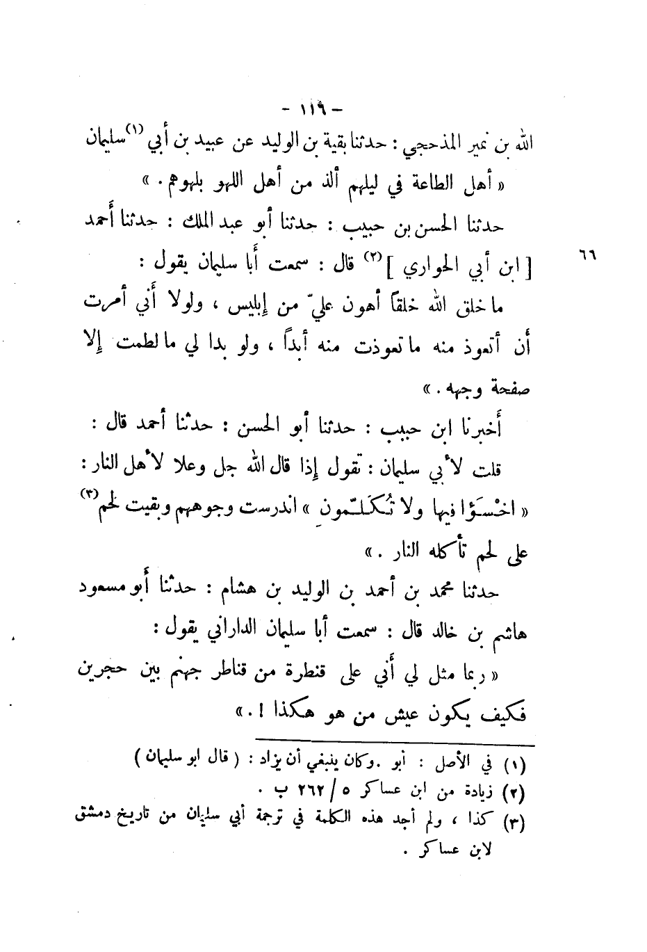 حَدَّثَنَا مُحَمَّدُ بْنُ أَحْمَدَ بْنِ الْوَلِيدِ بْنِ هِشَامٍ، حَدَّثَنَا أَبُو مَسْعُودٍ هَاشِمُ بْنُ خَالِدٍ، قَالَ: سَمِعْتُ أَبَا سُلَيْمَانَ الدَّارَانِيَّ، يَقُولُ: §«رُبَّمَا مُثِّلَ لِي أَنِّي عَلَى قَنْطَرَةٍ مِنْ قَنَاطِرِ جَهَنَّمَ أَنِّي بَيْنَ حَجَرَيْنِ، فَكَيْفَ يَكُونُ عَيْشُ مَنْ هُوَ هَكَذَا؟»