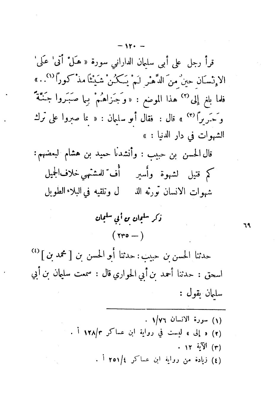 حَدَّثَنَا الْحَسَنُ بْنُ حَبِيبٍ، حَدَّثَنَا أَبُو الْحَسَنِ بْنُ مُحَمَّدِ بْنِ إِسْحَاقَ، حَدَّثَنَا أَحْمَدُ بْنُ أَبِي الْحَوَارِيِّ، قَالَ: سَمِعْتُ سُلَيْمَانَ بْنَ أَبِي سُلَيْمَانَ، يَقُولُ: «-[121]- إِنَّ §مَنْ لَمْ يُعْطَ مَا يَشْتَهِي مِنَ الْآخِرَةِ فِي الدُّنْيَا، إِنَّهُ يُعْطَاهُ فِي الْآخِرَةِ، وَأَحْسَبُ أَنَّ عَمَلًا لَا يُوجَدُ لَهُ لَذَّةٌ فِي الدُّنْيَا أَنَّهُ يَكُونُ لَهُ ثَوَابًا فِي الْآخِرَةِ»