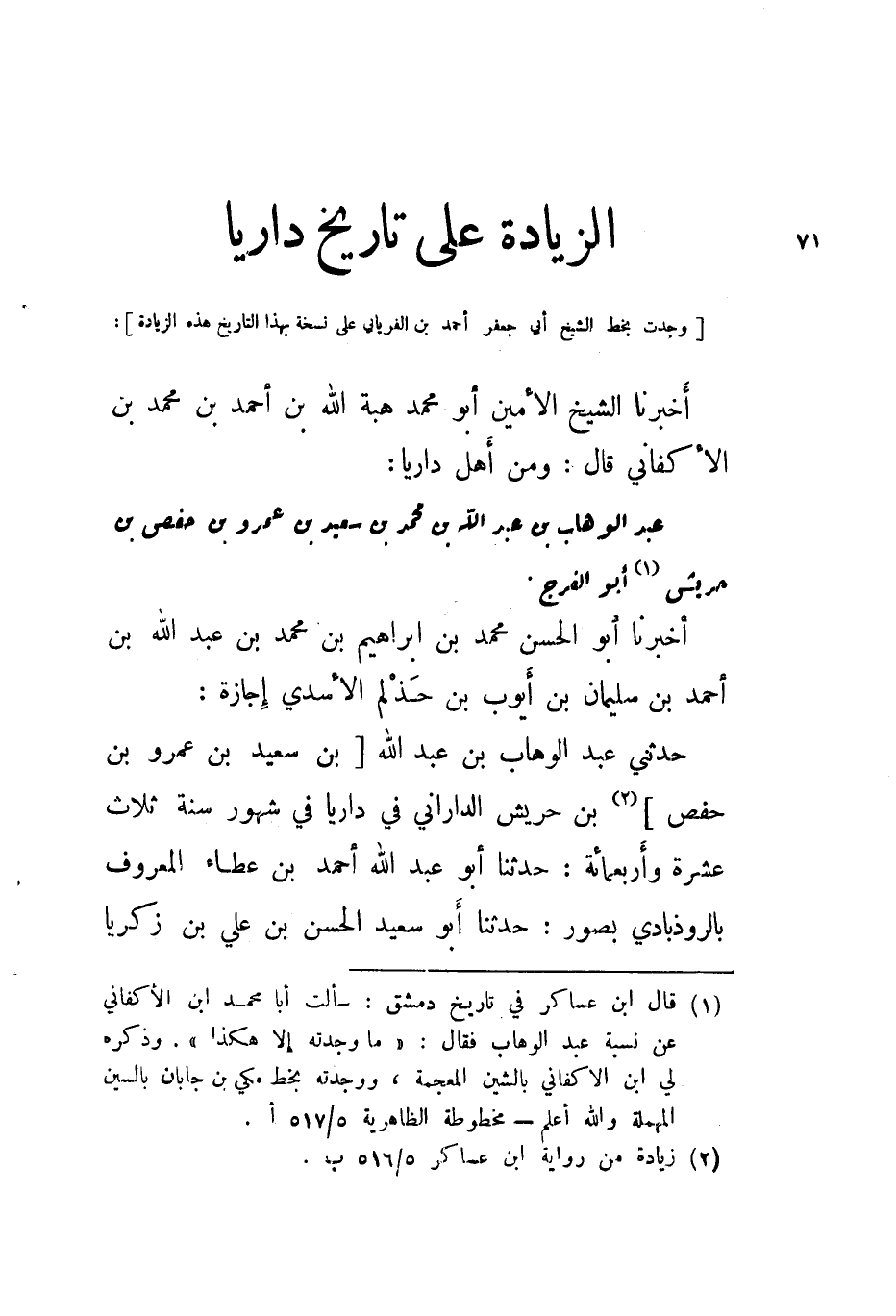 قَالَ الْحَافِظُ، وَأَخْبَرَنَا أَبُو مُحَمَّدٍ هِبَةَ اللهِ بْنُ أَحْمَدَ بْنُ مُحَمَّدِ بْنُ الْأَكْفَانِي، قَالَ: وَمِنْ أَهْلِ دَارِيَا: عَبْدُ الْوَّهَابِ بْنُ عَبْدِ اللَّهِ بْنُ مُحَمَّدِ بْنُ سَعِيدِ بْنُ عَمْرِو بْنُ حَفْصِ بْنُ حَرِيشٍ أَبُو الْفَرَجِ: أَخْبَرَنَا أَبُو الْحَسَنِ مُحَمَّدِ بْنِ إِبْرَاهِيمِ بْنِ مُحَمَّدِ بْنِ عَبْدِ اللَّهِ بْنِ أَحْمَدَ بْنِ سُلَيْمَانَ بْنِ أَيُّوبَ بْنِ حَذْلَمِ الْأُسْدِيِّ إِجَازَةً: حَدَثَنِي عَبْدُ الْوَهَّابِ بْنُ عَبْدِ اللَّهِ بْنُ مُحَمَّدِ بْنُ سَعِيدِ بْنُ عَمْرِو بْنُ حَفْصِ بْنُ حَرِيشِ الدَّارَانِي فِي دَارِيَّا، فِي شُهُورِ سَنَةِ ثَلَاثَ عَشْرَةَ وَأَرْبَعِمِائَةٍ: حَدَّثَنَا أَبُو عَبْدِ اللَّهِ أَحْمَدُ بْنُ عَطَاءِ الْمَعْرُوفِ بِالرُّوذْبَادِيِّ بِصِوَرِ؛ حَدَّثَنَا أَبُو سَعِيدِ الْحَسَنِ بْنِ عَلِيِّ بْنِ زَكَرِيَّا