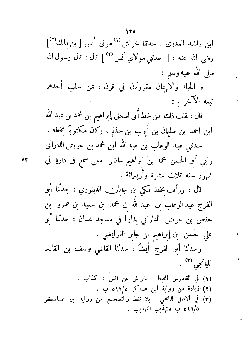 بْنِ رَاشِدَ الْعَدَوِي: حَدَّثَنَا خِرَاشُ مَوْلَى أَنَسِ: حَدَّثَنِي مَوْلَاي أَنَسِ، قَالَ: قَالَ رَسُولُ اللَّهِ صَلَّى اللَّهُ عَلَيْهِ وَسَلَّمَ: «§الَحَيَاءُ وَالْإِيمَانُ مَقْرُونَانِ فِي قَرَنٍ، فَمَنْ سَلَبَ أَحَدَهُمَا تَبِعَهُ الْآخَرَ» قَالَ: نَقَلْتُ ذَلِكَ مَنْ خَطِّ أَبِي إِسْحَاقَ إِبْرَاهِيمِ بْنِ مُحَمَّدِ بْنِ عَبْدِ اللَّهِ بْنِ مُحَمَّدِ بْنِ حَرِيشَ الدَّارَانِي، وَابْنَيْ أَبُو الْحَسَنِ مُحَمَّدِ بْنِ إِبْرَاهِيمَ حَاضِرَ مَعِي يَسْمَعُ فِي دَارِيَا فِي شُهُورِ سَنَةِ ثَلَاثِ عَشَرَةَ وَأَرْبَعِمِئَةِ. قَالَ: قَرَأْتُ بِخَطٍّ مَكِّيِّ بْنِ جَابَانِ الدَّيْنُوَرِي: حَدَّثَنَا أَبُو الْفَرَجُ عَبْدُ الْوَهَّابِ بْنُ عَبْدِ اللَّهِ بْنُ مُحَمَّدِ بْنُ سَعِيدِ بْنُ عَمْرِو بْنُ حَفْصِ بْنُ حَرِيشِ الدَّارَانِي بِدَارِيَا، فِي مَسْجِدِ غَسَّانَ: حَدَّثَنَا أَبُو عَلِيِّ الْحُسَيْنُ بْنُ إِبْرَاهِيمَ بْنُ جَابِرَ الْفرَائِضِي. وَحَدَّثَنَا أَبُو الْفَرَجِ أَيْضًا: حَدَّثَنَا الْقَاضِي يُوسُفُ بْنُ الْقَاسِمِ الْمَيَانَجِي