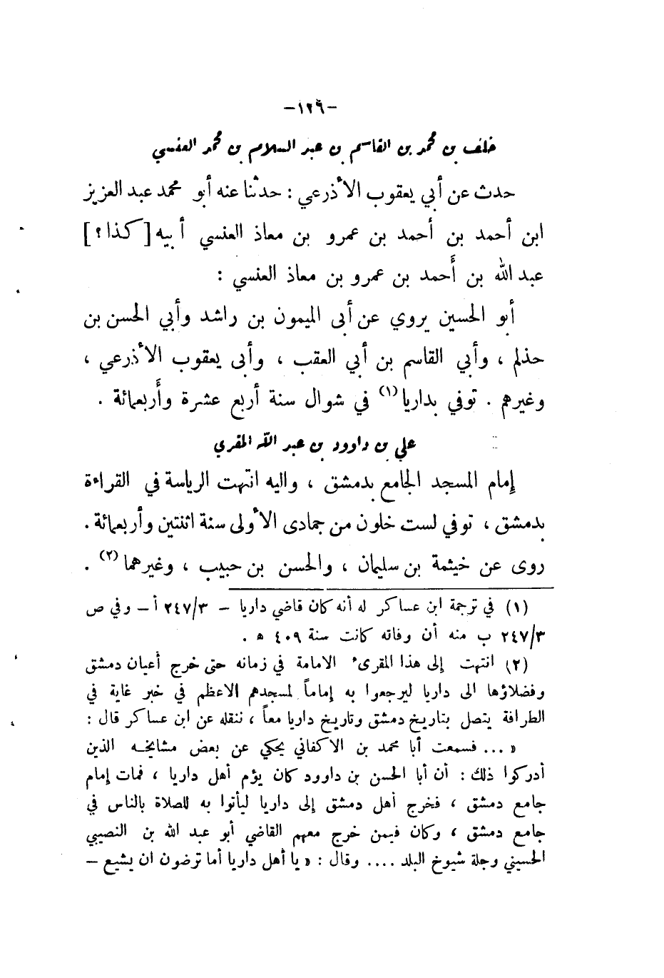 §عَلِيُّ بْنُ دَاوُدَ بْنُ عَبْدِ اللَّهِ الْمُقْرِيُّ إِمَامَ الْمَسْجِدِ الْجَامِعِ بِدِمَشْقِ، وَإِلَيْهِ انْتَهَتِ الرِّيَاسَةُ فِي الْقِرَاءَةِ بِدِمَشْقِ، تَوَفَّى لِسِتٍ خَلَوْنَ مِنْ جُمَادَى الْأُولَى سَنَةِ اثْنَتَيْنِ وَأَرْبَعُمِئَةٍ. رَوَى عَنْ خَيْثَمَةَ بْنِ سُلَيْمَانَ وَالْحَسَنِ بْنِ حَبِيبِ وَغَيْرَهُمَا