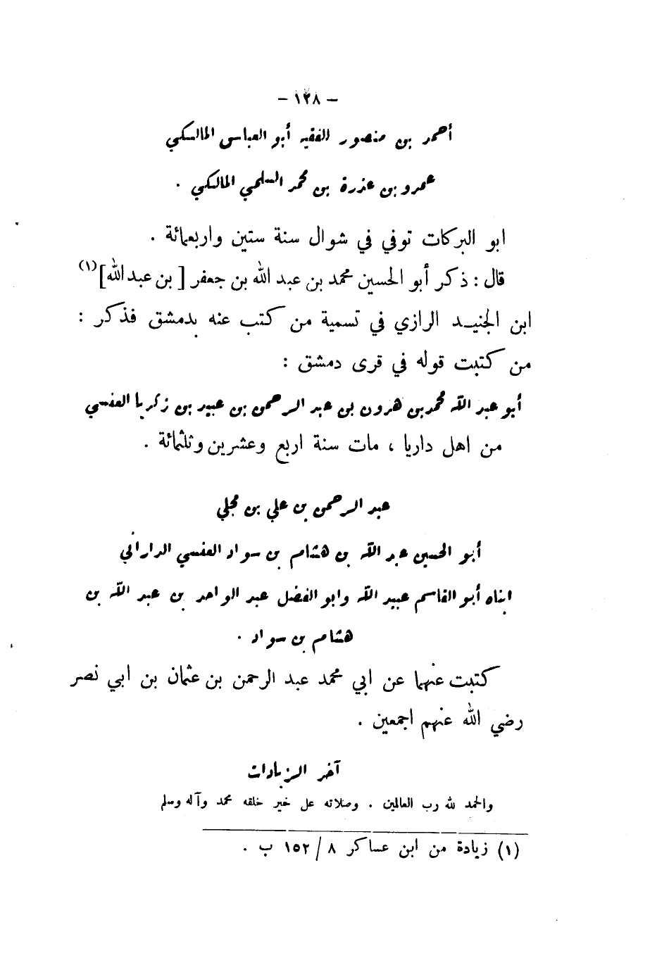 §عَمْرُو بْنُ عُذْرَةَ بْنُ مُحَمَّدِ السَّلْمِيِّ الْمَالِكِيِّ أَبُو الْبَرَكَاتِ، تَوَفَّى فِي شَوَّالٍ سَنَةِ سَتِّينَ وَأَرْبَعِمِائَةٍ. قَالَ: ذَكَرَ أَبُو الْحَسَنِ مُحَمَّدُ بْنُ عَبْدِ اللَّهِ بْنُ جَعْفَرَ بْنُ عَبْدِ اللَّهِ بْنُ الْجُنَيدِ الرَّازِي فِي تَسْمِيَةِ مَنْ كَتَبَ عَنْهُ بِدِمَشْقِ، فَذَكَرَ: " وَمِمَّنْ كَتَبْتَ عَنْهُ فِي قُرَى دِمَشْقِ