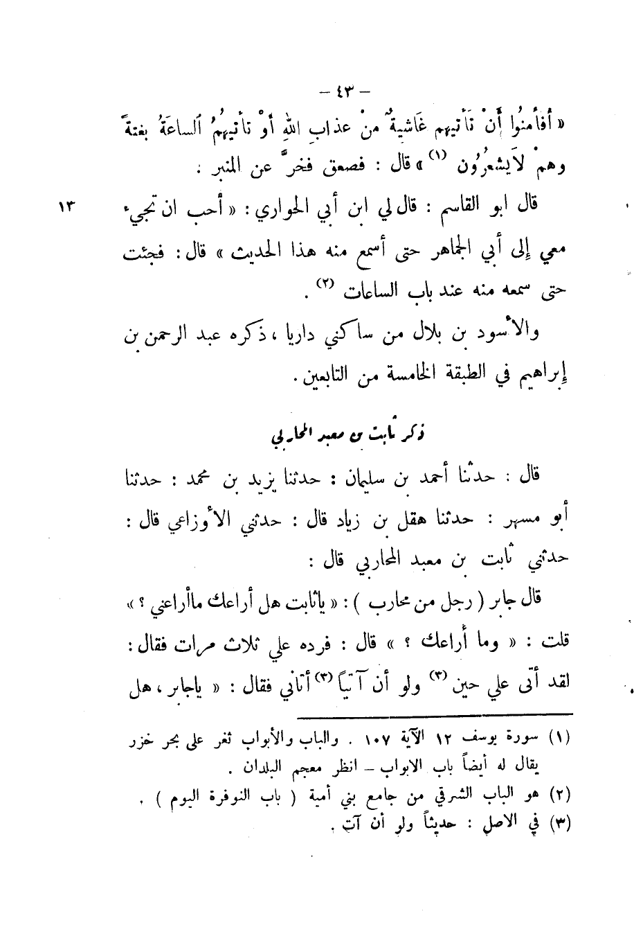 قَالَ: حَدَّثَنَا أَحْمَدُ بْنُ سُلَيْمَانَ، حَدَّثَنَا يَزِيدُ بْنُ مُحَمَّدٍ، حَدَّثَنَا أَبُو مُسْهِرٍ، حَدَّثَنَا هِقْلُ بْنُ زِيَادٍ، حَدَّثَنِي الْأَوْزَاعِيُّ، حَدَّثَنِي ثَابِتُ بْنُ مَعْبَدٍ الْمُحَارِبِيُّ، قَالَ: قَالَ جَابِرٌ، رَجُلٌ مِنْ مُحَارِبٍ: «يَا ثَابِتُ، §هَلْ أَرَاعَكَ مَا أَرَاعَنِي؟» قُلْتُ: وَمَا أَرَاعَكَ؟ قَالَ: فَرَدَّهُ عَلَيَّ ثَلَاثَ مَرَّاتٍ، فَقَالَ: «لَقَدْ أَتَى عَلَيَّ حَدِيثٌ، وَلَوْ أَنَّ آتِيًا أَتَانِي» فَقَالَ: يَا جَابِرُ، هَلْ -[44]- فِي قَوْمِكَ امْرُؤُ سَوْءٍ؟ " لَقُمْتُ أَتَذَكَّرُ: هَلْ فِيهِمُ امْرُؤُ سَوْءٍ؟ وَهَذَا أَنَا لَوْ أَتَانِي آتٍ " فَقَالَ: يَا جَابِرُ، هَلْ فِي قَوْمِكَ امْرُؤٌ صَالِحٌ؟ " لَقُمْتُ أَتَذَكَّرُ: هَلْ فِيهِمُ امْرُؤٌ صَالِحٌ " وَثَابِتٌ وَعَطِيَّةُ ابْنَا مَعْبَدٍ الْمُحَارِبِيَّانِ مِنْ سَاكِنِي دَارِيَّا، وَرَوَى عَنْهُمَا الْأَوْزَاعِيُّ، وَذَكَرَهُمَا عَبْدُ الرَّحْمَنِ بْنُ إِبْرَاهِيمَ فِي التَّابِعِينَ