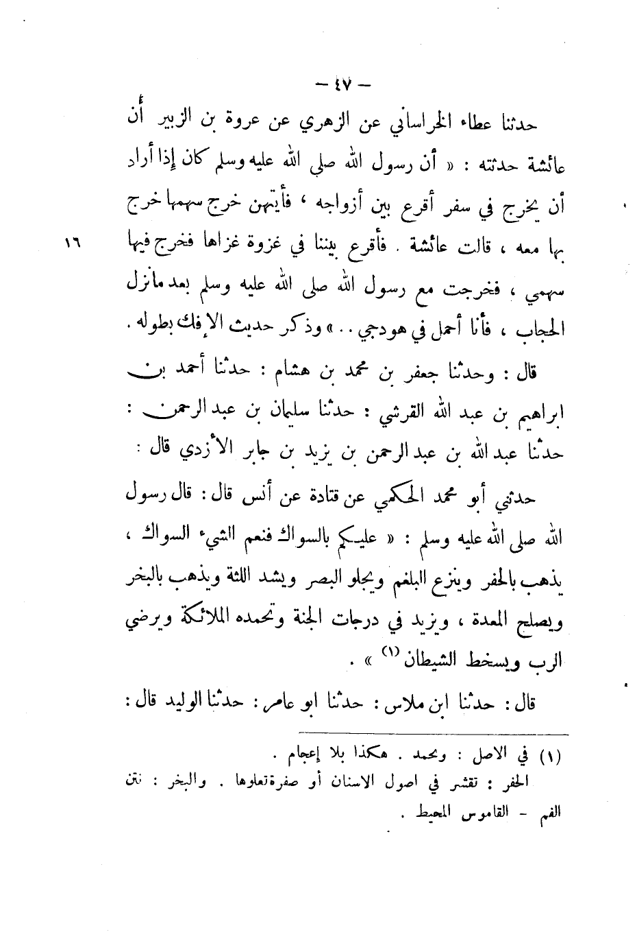 قَالَ: حَدَّثَنَا جَعْفَرُ بْنُ مُحَمَّدِ بْنِ هِشَامٍ، حَدَّثَنَا أَحْمَدُ بْنُ إِبْرَاهِيمَ بْنِ عَبْدِ اللَّهِ الْقُرَشِيُّ، حَدَّثَنَا سُلَيْمَانُ بْنُ عَبْدِ الرَّحْمَنِ، حَدَّثَنَا عَبْدُ اللَّهِ بْنُ عَبْدِ الرَّحْمَنِ بْنِ يَزِيدَ بْنِ جَابِرٍ الْأَزْدِيُّ، حَدَّثَنِي أَبُو مُحَمَّدٍ الْحَكَمِيُّ، عَنْ قَتَادَةَ، عَنْ أَنَسٍ، قَالَ: قَالَ رَسُولُ اللَّهِ صَلَّى اللَّهُ عَلَيْهِ وَسَلَّمَ: «§عَلَيْكُمْ بِالسِّوَاكِ، فَنِعْمَ الشَّيْءُ السِّوَاكُ، يَذْهَبُ بِالْحُفَرِ، وَيَنْزِعُ الْبَلْغَمَ، وَيَجْلُو الْبَصَرَ، وَيَشُدُّ اللِّثَةَ، وَيَذْهَبُ بِالْبَخْرِ، وَيُصْلِحُ الْمَعِدَةَ، وَيَزِيدُ فِي دَرَجَاتِ الْجَنَّةِ، وَتَحْمَدُهُ الْمَلَائِكَةُ، وَيُرْضِي الرَّبَّ، وَيُسْخِطُ الشَّيْطَانَ»