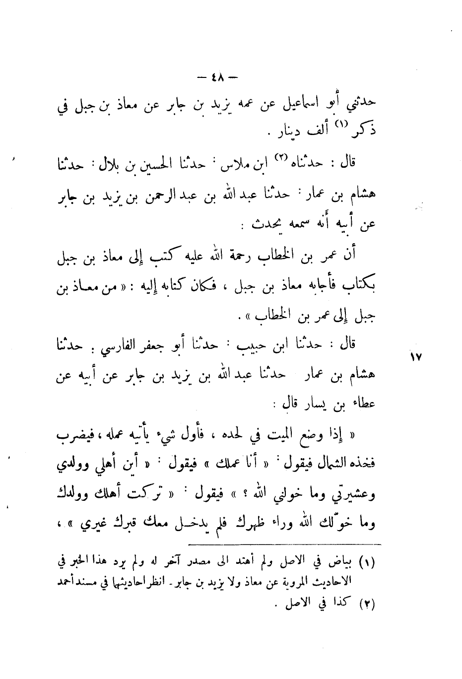 قَالَ: حَدَّثَنَا ابْنُ مَلَّاسٍ، حَدَّثَنَا الْحُسَيْنُ بْنُ بِلَالٍ، حَدَّثَنَا هِشَامُ بْنُ عَمَّارٍ، حَدَّثَنَا عَبْدُ اللَّهِ بْنُ عَبْدِ الرَّحْمَنِ بْنِ يَزِيدَ بْنِ جَابِرٍ، عَنْ أَبِيهِ أَنَّهُ سَمِعَهُ يُحَدِّثُ، أَنَّ عُمَرَ بْنَ الْخَطَّابِ رَحْمَةُ اللَّهِ عَلَيْهِ كَتَبَ إِلَى مُعَاذِ بْنِ جَبَلٍ بِالْكِتَابِ، فَأَجَابَهُ مُعَاذُ بْنُ جَبَلٍ وَكَانَ كِتَابُهُ إِلَيْهِ: §«مِنْ مُعَاذِ بْنِ جَبَلٍ إِلَى عُمَرَ بْنِ الْخَطَّابِ»