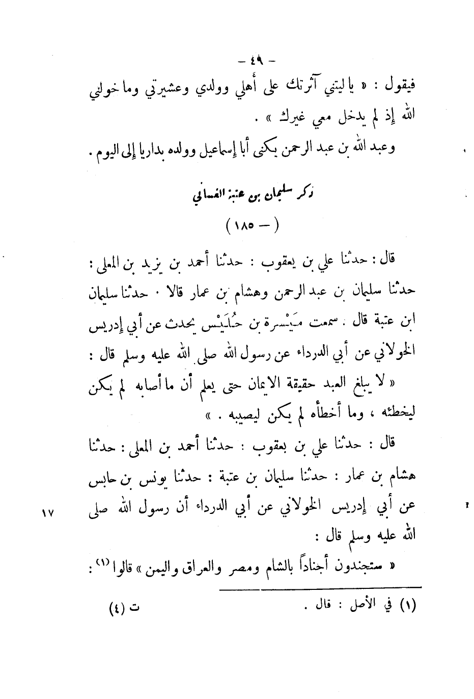 قَالَ: حَدَّثَنَا عَلِيُّ بْنُ يَعْقُوبَ، حَدَّثَنَا أَحْمَدُ بْنُ يَزِيدَ بْنِ الْمُعَلَّى، حَدَّثَنَا سُلَيْمَانُ بْنُ عَبْدِ الرَّحْمَنِ، وَهِشَامُ بْنُ عَمَّارٍ، قَالَا: حَدَّثَنَا سُلَيْمَانُ بْنُ عُتْبَةَ، قَالَ: سَمِعْتُ ابْنَ مَيْسَرَةَ بْنِ حَلْبَسٍ، يُحَدِّثُ عَنْ أَبِي إِدْرِيسَ الْخَوْلَانِيِّ، عَنْ أَبِي الدَّرْدَاءِ، عَنْ رَسُولِ اللَّهِ صَلَّى اللَّهُ عَلَيْهِ وَسَلَّمَ قَالَ: " §سَتَجِدُونَ أَجْنَادًا: جُنْدًا بِالشَّامِ وَمِصْرَ وَالْعِرَاقِ وَالْيَمَنِ "، -[50]- قُلْنَا: فَخِرْ لَنَا يَا رَسُولَ اللَّهِ، قَالَ: «عَلَيْكُمْ بِالشَّامِ» ، قَالُوا: إِنَّا أَصْحَابُ مَاشِيَةٍ وَعَمُودٍ وَلَا نُطِيقُ الشَّامَ، قَالَ: «فَمَنْ لَمْ يُطِقْ الشَّامَ فَلْيَلْحَقْ بِيَمَنِهِ، وَلْيَسْقِ بِغُدُرِهِ، فَإِنَّ اللَّهَ عَزَّ وَجَلَّ تَكَفَّلَ لِي بِالشَّامِ وَأَهْلِهِ»