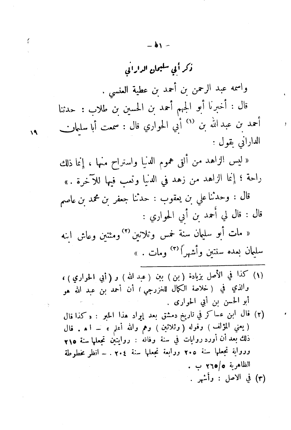 قَالَ: أَخْبَرَنَا أَبُو الْجَهْمِ أَحْمَدُ بْنُ الْحُسَيْنِ بْنِ طِلَابٍ، حَدَّثَنَا أَحْمَدُ بْنُ عَبْدِ اللَّهِ بْنِ أَبِي الْحَوَارِيِّ، قَالَ: سَمِعْتُ أَبَا سُلَيْمَانَ الدَّارَانِيَّ، يَقُولُ: «§لَيْسَ الزَّاهِدُ مَنْ أَلْقَى هُمُومَ الدُّنْيَا وَاسْتَرَاحَ مِنْهَا، إِنَّمَا ذَلِكَ رَاحَةٌ؛ إِنَّمَا الزَّاهِدُ مَنْ زَهِدَ فِي الدُّنْيَا وَتَعِبَ فِيهَا لِلْآخِرَةِ» قَالَ: وَحَدَّثَنَا عَلِيُّ بْنُ يَعْقُوبَ، حَدَّثَنَا جَعْفَرُ بْنُ مُحَمَّدِ بْنِ عَاصِمٍ، قَالَ: قَالَ لِي أَحْمَدُ بْنُ أَبِي الْحَوَارِيِّ: مَاتَ أَبُو سُلَيْمَانَ سَنَةَ خَمْسٍ وَثَلَاثِينَ وَمِئَتَيْنٍ، وَعَاشَ ابْنُهُ سُلَيْمَانُ بَعْدَهُ سَنَتَيْنِ وَأَشْهُرًا وَمَاتَ