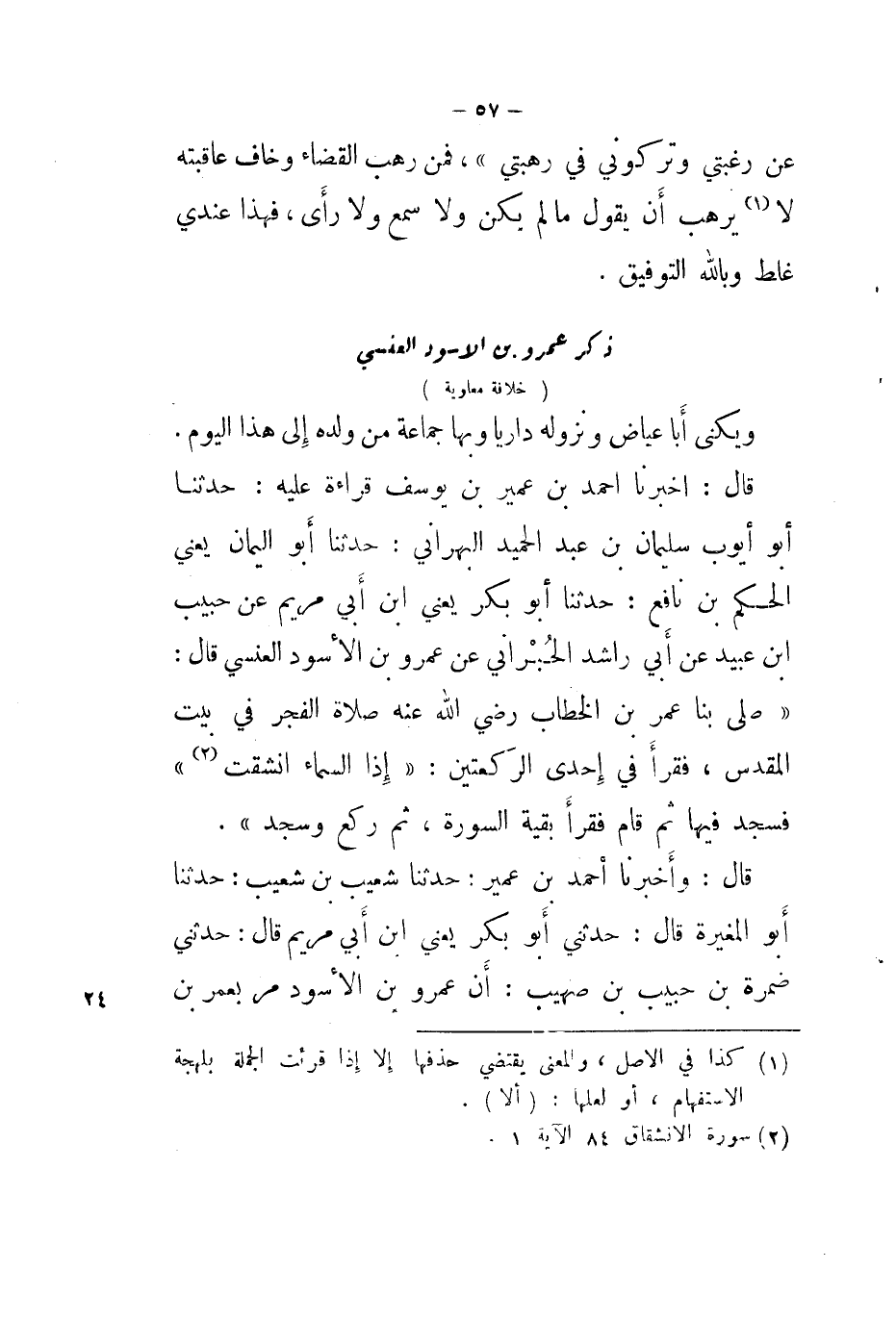 قَالَ: أَخْبَرَنَا أَحْمَدُ بْنُ عُمَيْرِ بْنِ يُوسُفَ، قِرَاءَةً عَلَيْهِ، حَدَّثَنَا أَبُو أَيُّوبَ سُلَيْمَانُ بْنُ عَبْدِ الْحَمِيدِ الْبَهْرَانِيُّ، حَدَّثَنَا أَبُو الْيَمَانِ يَعْنِي الْحَكَمَ بْنَ نَافِعٍ، حَدَّثَنَا أَبُو بَكْرٍ يَعْنِي ابْنَ أَبِي مَرْيَمَ، عَنْ حَبِيبِ بْنِ عُبَيْدٍ، عَنْ أَبِي رَاشِدٍ الْحُبْرَانِيِّ، عَنْ عَمْرِو بْنِ الْأَسْوَدِ الْعَنْسِيِّ، قَالَ: §" صَلَّى بِنَا عُمَرُ بْنُ الْخَطَّابِ رَضِيَ اللَّهُ عَنْهُ صَلَاةَ الْفَجْرِ فِي بَيْتِ الْمَقْدِسِ، فَقَرَأَ فِي إِحْدَى الرَّكْعَتَيْنِ: إِذَا السَّمَاءُ انْشَقَّتْ فَسَجَدَ فِيهَا، ثُمَّ قَامَ فَقَرَأَ بَقِيَّةَ السُّورَةِ ثُمَّ رَكَعَ وَسَجَدَ "