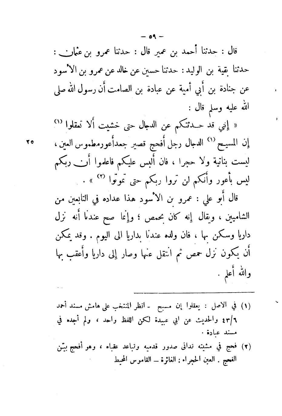 قَالَ: حَدَّثَنَا أَحْمَدُ بْنُ عُمَيْرٍ، قَالَ: حَدَّثَنَا عَمْرُو بْنُ عُثْمَانَ، حَدَّثَنَا بَقِيَّةُ بْنُ الْوَلِيدِ، حَدَّثَنَا بُجَيْرٌ، عَنْ خَالِدٍ، عَنْ عَمْرِو بْنِ الْأَسْوَدِ، عَنْ جُنَادَةَ بْنِ أَبِي أُمَيَّةَ، عَنْ عُبَادَةَ بْنِ الصَّامِتِ أَنَّ رَسُولَ اللَّهِ صَلَّى اللَّهُ عَلَيْهِ وَسَلَّمَ قَالَ: «إِنِّي قَدْ حَدَّثْتُكُمْ عَنِ الدَّجَّالِ حَتَّى خَشِيتُ أَلَّا تَعْقِلُوا، إِنَّ §الْمَسِيحَ الدَّجَّالَ رَجُلٌ أَفْحَجُ قَصِيرٌ جَعْدٌ أَعْوَرُ مَطْمُوسُ الْعَيْنِ، لَيْسَتْ بِنَاتِيَةٍ وَلَا حَجَرًا، فَإِنْ أُلْبِسَ عَلَيْكُمْ فَاعْلَمُوا أَنَّ رَبَّكُمْ لَيْسَ بِأَعْوَرَ، وَأَنَّكُمْ لَنْ تَرَوْا رَبَّكُمْ حَتَّى تَمُوتُوا» قَالَ أَبُو عَلِيٍّ: وَعَمْرُو بْنُ الْأَسْوَدِ هَذَا عِدَادُهُ فِي التَّابِعِينَ مِنَ الشَّامِيِّينَ، وَيُقَالُ: إِنَّهُ كَانَ بِحِمْصَ، وَإِنَّمَا صَحَّ عِنْدَنَا أَنَّهُ نَزَلَ دَارِيَّا وَسَكَنَ بِهَا، فَإِنَّ وَلَدَهُ عِنْدَنَا بِدَارِيَّا إِلَى الْيَوْمِ وَقَدْ يُمْكِنُ أَنْ يَكُونَ نَزَلَ بِحِمْصَ ثُمَّ انْتَقَلَ عَنْهَا وَصَارَ إِلَى دَارِيَّا وَأَعْقَبَ بِهَا، وَاللَّهُ أَعْلَمُ