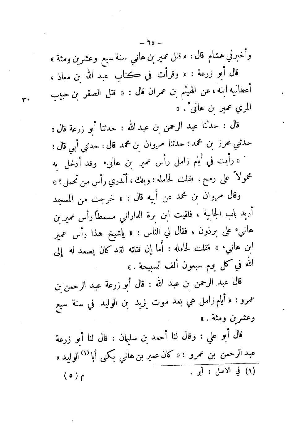 وَقَالَ مَرْوَانُ بْنُ مُحَمَّدٍ، عَنْ أَبِيهِ، قَالَ: " خَرَجْتُ مِنَ الْمَسْجِدِ أُرِيدُ بَابَ الْجَابِيَةِ، فَلَقِيتُ ابْنَ مُرَّةَ الدَّارَانِيَّ مُسْمِطًا رَأْسَ عُمَيْرِ بْنِ هَانِئٍ عَلَى بِرْذَوْنٍ، فَقَالَ لِيَ النَّاسُ: يَا شَيْخُ، هَذَا رَأْسُ عُمَيْرِ بْنِ هَانِئٍ فَقُلْتُ لِحَامِلِهِ: أَمَا إِنْ قَتَلْتَهُ لَقَدْ كَانَ §يَصْعَدُ لَهُ إِلَى اللَّهِ عَزَّ وَجَلَّ فِي كُلِّ يَوْمٍ سَبْعُونَ أَلْفَ تَسْبِيحَةٍ " قَالَ عَبْدُ الرَّحْمَنِ بْنُ عَبْدِ اللَّهِ: قَالَ أَبُو زُرْعَةَ عَبْدُ الرَّحْمَنِ بْنُ عَمْرٍو: أَيَّامُ زَامِلٍ هِيَ بَعْدَ مَوْتِ يَزِيدَ بْنِ الْوَلِيدِ فِي سَنَةِ سَبْعٍ وَعِشْرِينَ وَمِائَةٍ قَالَ أَبُو عَلِيٍّ: وَقَالَ لَنَا أَحْمَدُ بْنُ سُلَيْمَانَ: قَالَ لَنَا أَبُو زُرْعَةَ عَبْدُ الرَّحْمَنِ بْنُ عَمْرٍو: كَانَ عُمَيْرُ بْنُ هَانِئٍ يُكَنَّى أَبَا الْوَلِيدِ،